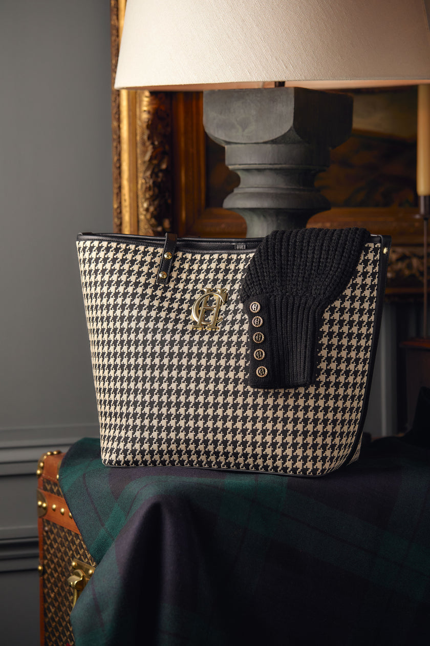 Perfectly sized for everyday wear, this tote bag has been beautifully designed with a classic houndstooth shell with elegant leather trims. With leather handles and spacious interior, the internal details and pocket ensure practicality when wearing. Detailed with a statement HC logo to the centre front.