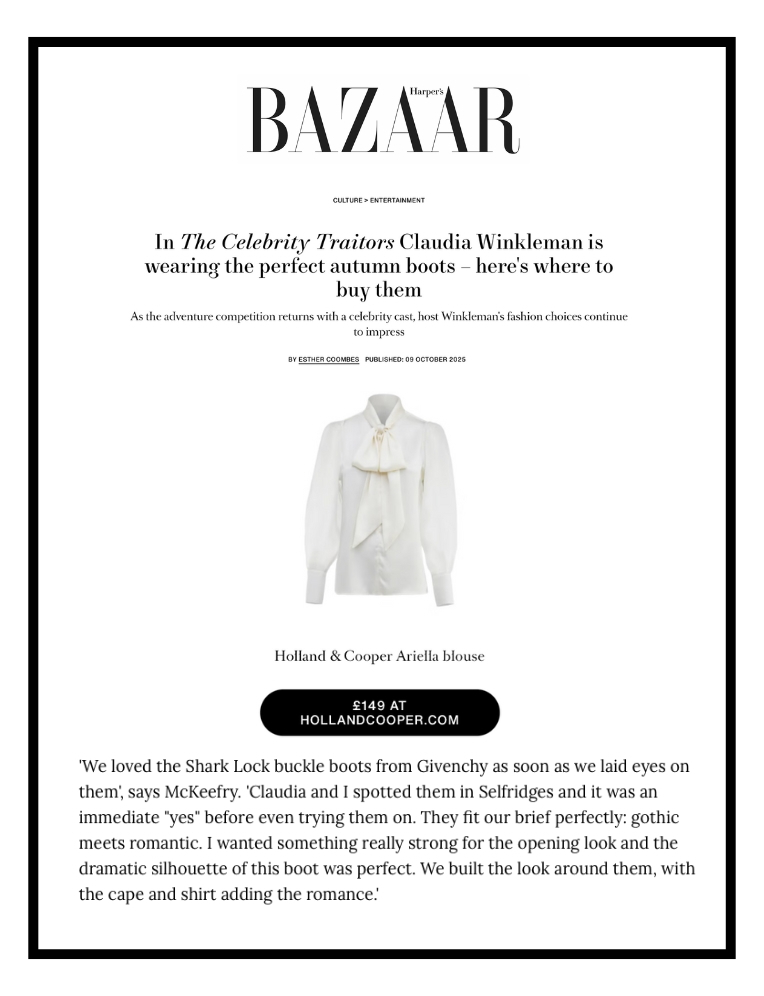 We were delighted to see our Ariella Blouse featured in Harper's Bazaar, off the back of Claudia Winkleman wearing it during Celebrity Traitors!