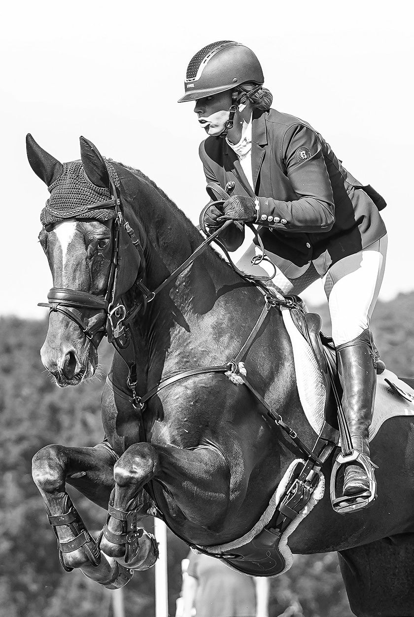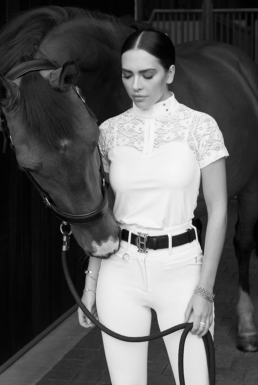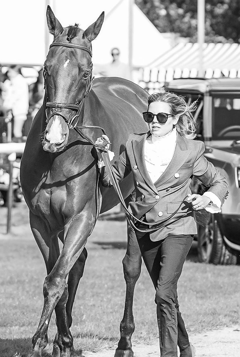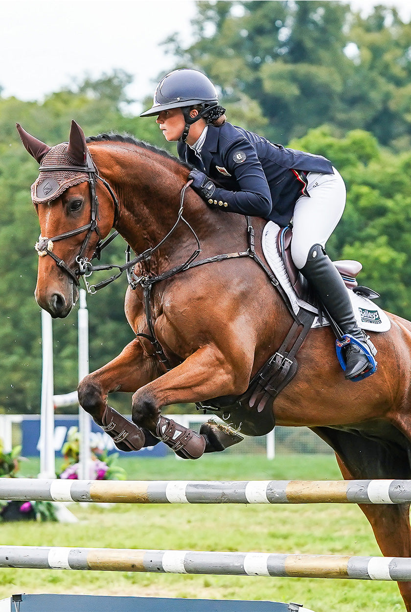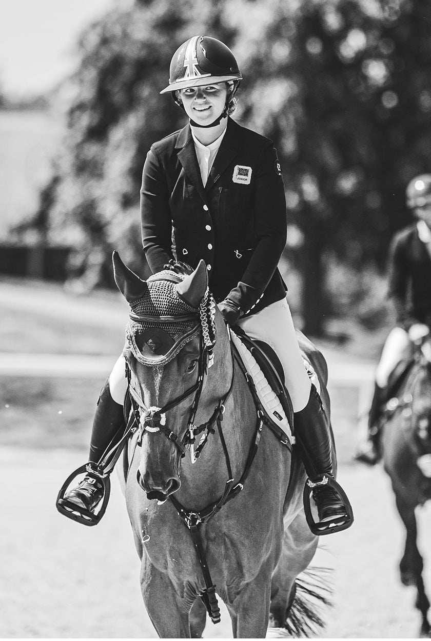 Coco Lanni, a British Event Rider who again was selected to represent Great Britain at the Junior Europeans in 2024 where her classy performance helped the team gain a 3rd place finish at such a prestigious event. Coco campaigns her top horse Porsche at the 2* level and has had an excellent start to the season winning the Novice U18 at Burnham Market. Coco proudly wears our technical competition clothing while training and during events and looks forward to wearing our timeless tailored pieces during trot ups this season.