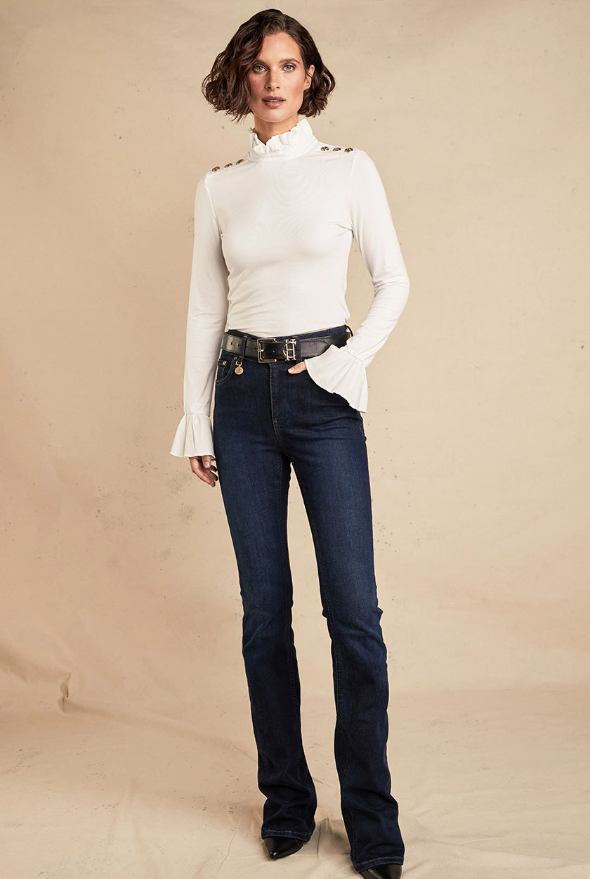 Our signature Jodhpur Jeans are woven with an ample amount of stretch to sculpt and flatter your silhouette to the max. Designed to sit high on the waist while ensuring they do not cut in. Tuck your sweater or blouse into the sculpting high-rise waist for an extra stylish look and feel. Designed to fit multiple leg lengths.