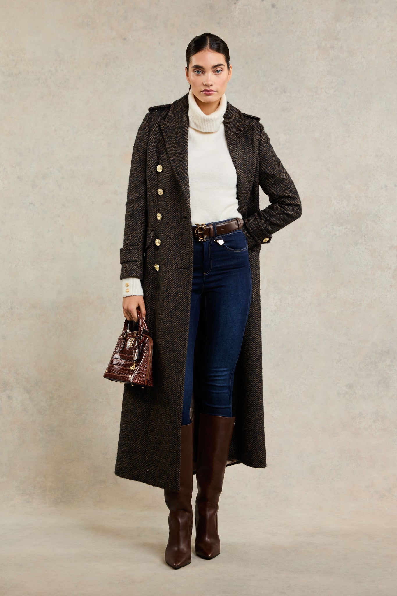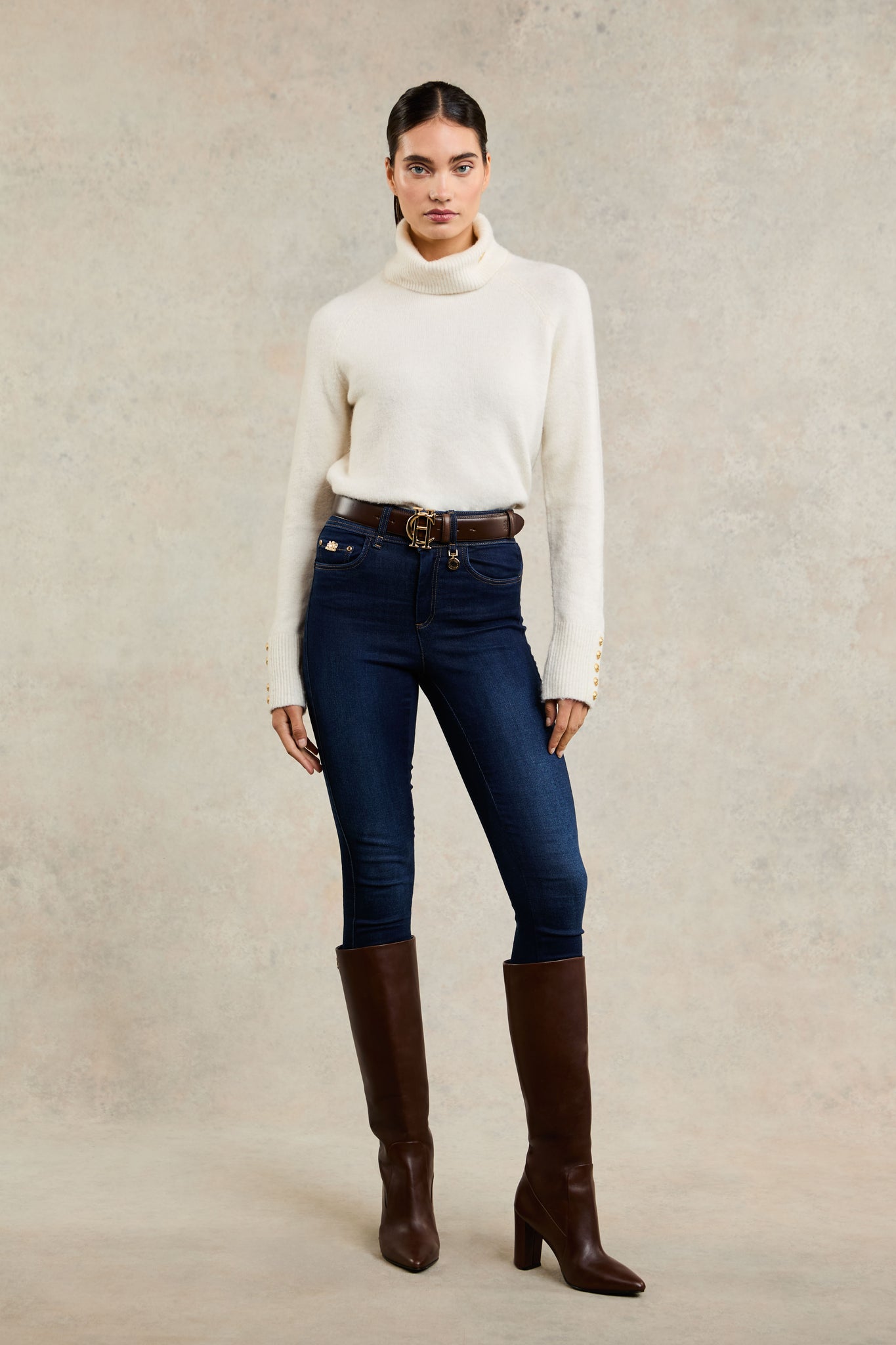 The latest edition to our jean collection, each pair has been woven with an ample amount of stretch to sculpt and flatter your silhouette. Created with Thermolite Polyester Yarns to trap air and hold warm, these jeans are a cold-weather essential. With an internal fleece lining, high waisted fit, and back pockets, the jeans have been detailed with our iconic hardware.