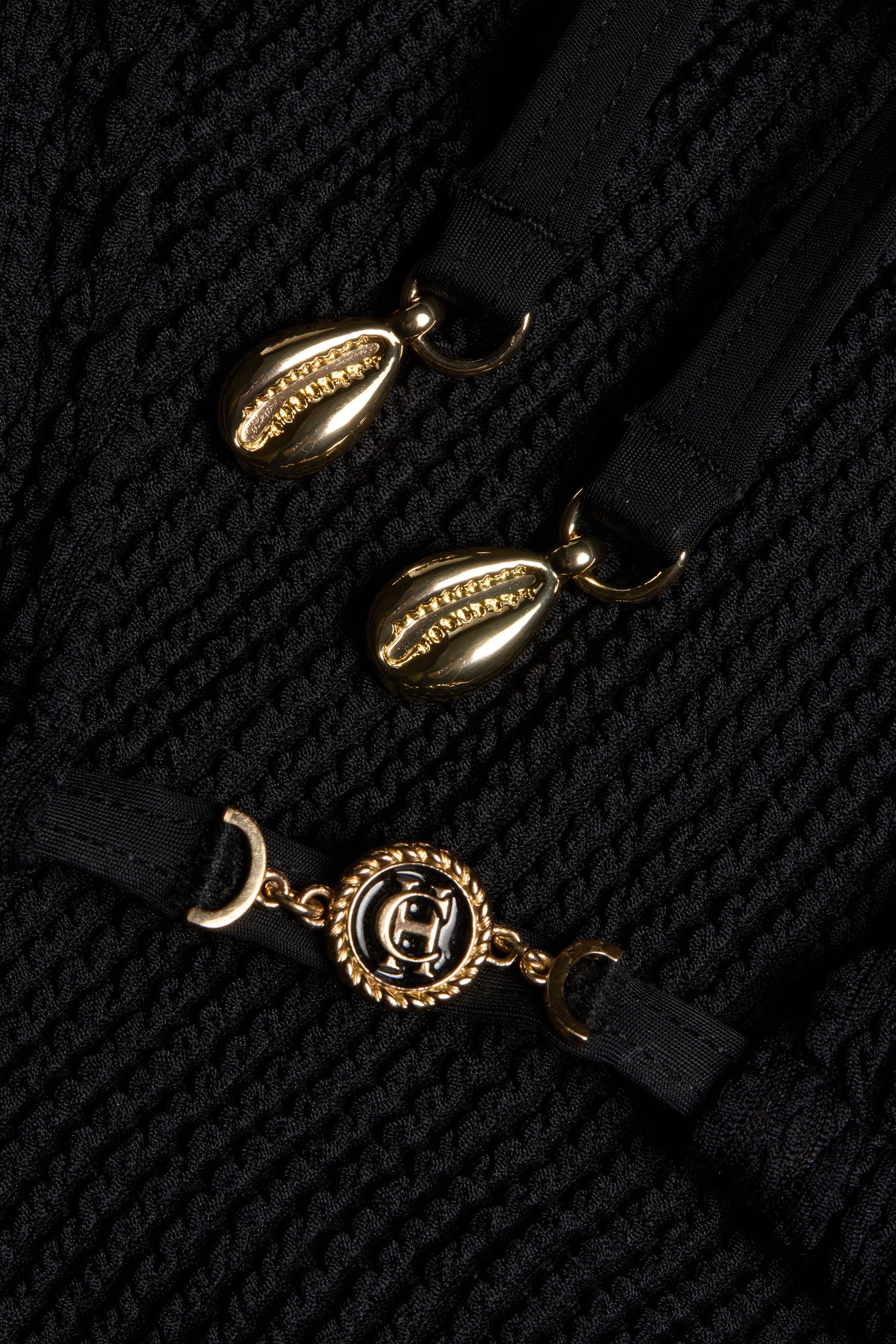 Exude effortless sophistication in our Black Triangle Bikini, crafted from luxurious crinkle fabric that embraces your silhouette. This refined two-piece showcases our signature attention to detail with elegant neck and back ties, each finished with delicate shell charms - a subtle nod to coastal refinement. The triangle top features our distinguished HC charm at the centre, while the medium coverage bottoms are adorned with matching charms at each side. This premium swimwear piece offers both comfort and style. A must-have addition to your luxury resort wear collection.