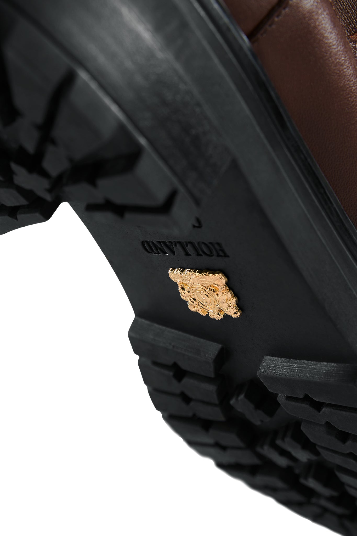 The epitome of minimalist chic, this classic knee boot has been inspired with a subtle touch of our equestrian heritage. Created from a premium leather with matching lining. Designed with a classic almond toe with a chunky tracked sole, this boot ensures a comfortable & stylish wear. Subtly detailed with a delicate HC pin.