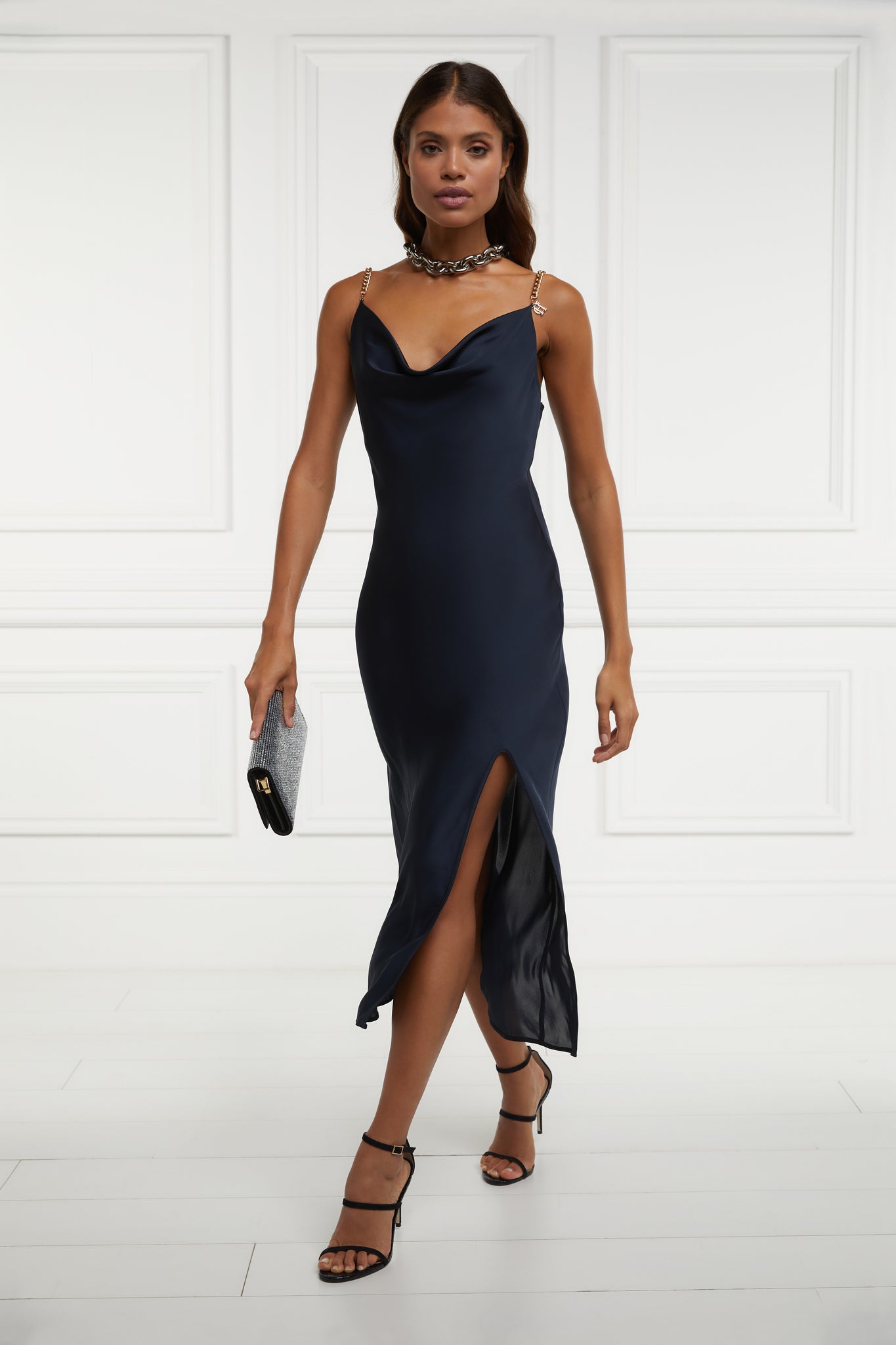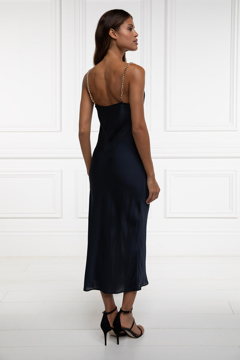 Crafted from an elegant satin fabric, this dress has been designed with a figure-hugging silhouette with a longer length and side split. With an elegant cowl neckline and removable gold chain straps, this piece is both feminine and eye-catching. Subtly detailed with a delicate HC charm.