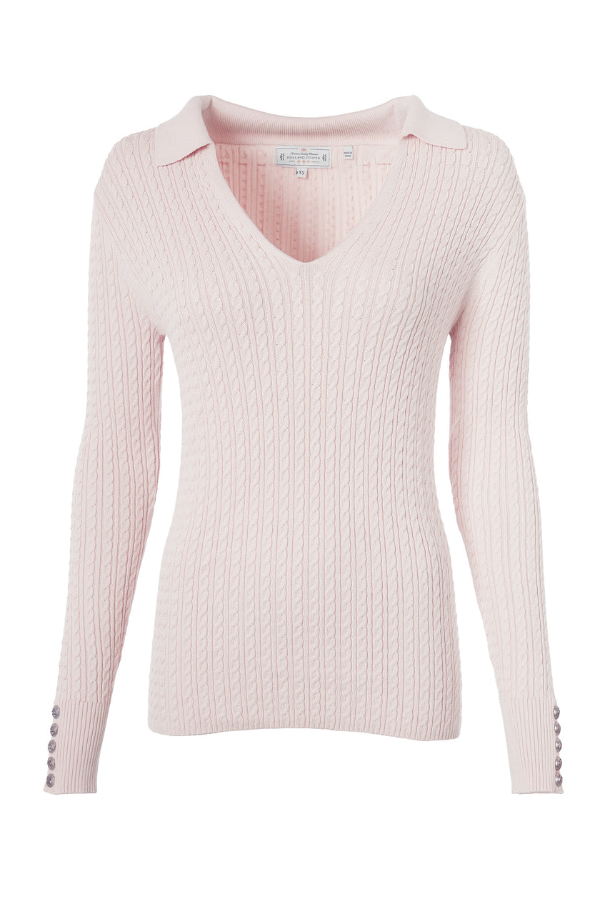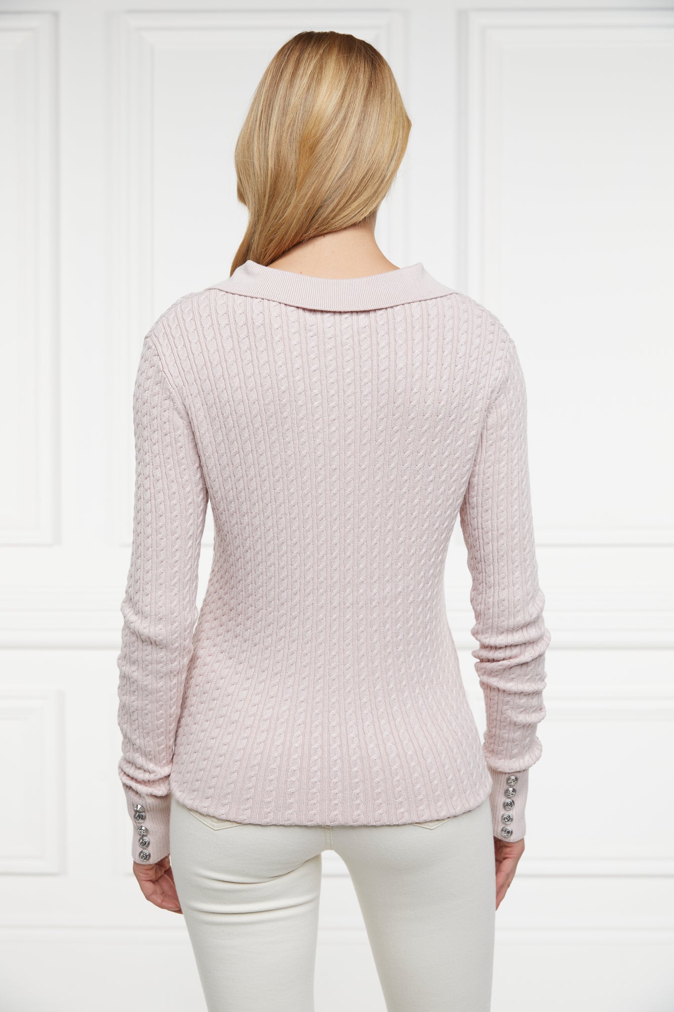 Crafted from a luxurious super soft yarn, this jumper ensures a sumptuously cosy feel against your skin. With an intricate cable design with a slim silhouette and deep v collar neckline. Beautifully elevated with silver hardware on the cuffs.