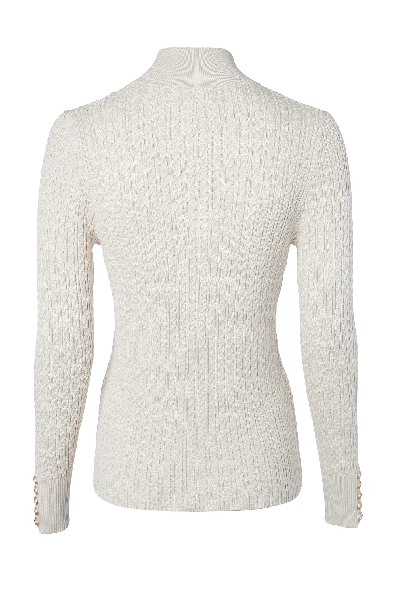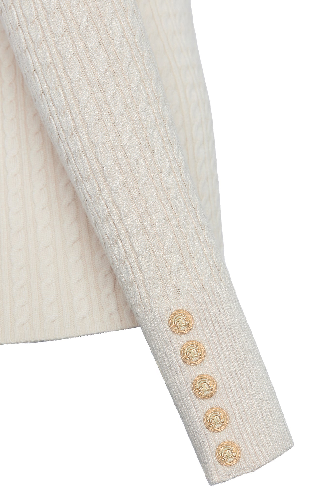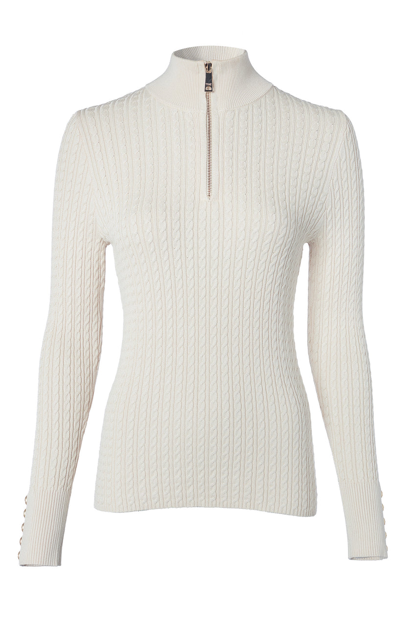 Crafted from a luxurious super soft yarn, this jumper ensures a sumptuously cosy feel against your skin. With an intricate cable design with a slim silhouette, the monogrammed henley zip offers versatility in styling. Beautifully elevated with gold hardware on the cuffs.