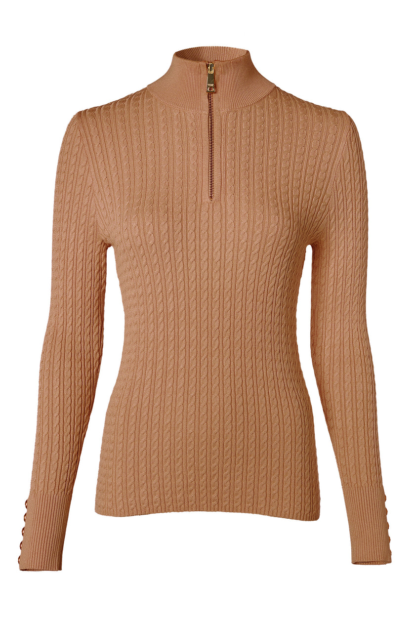 Crafted from a luxurious super soft yarn, this jumper ensures a sumptuously cosy feel against your skin. With an intricate cable design with a slim silhouette, the monogrammed henley zip offers versatility in styling. Beautifully elevated with gold hardware on the cuffs.