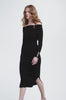 womens black long sleeved ribbed knitted bardot midi dress with gold buttons on cuffs