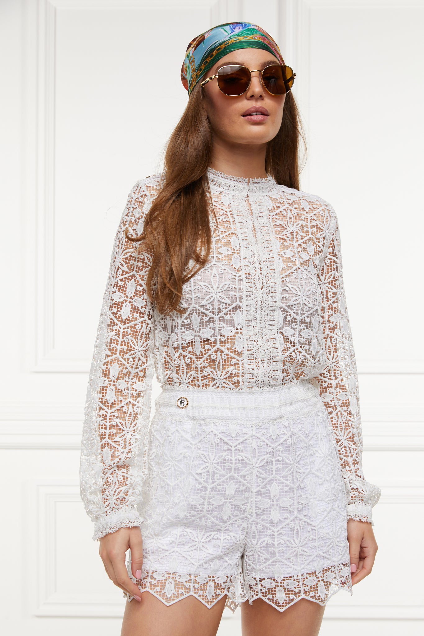 Made from a lightweight floral lace material, this shirt is the perfect beach cover-up. Designed with a crew neck and contrasting lace trim to the front placket with our HC rivets on the shoulder. With its elasticated cuffs creating a romantic floaty sleeve, this shirt is perfect for a summer day. -
