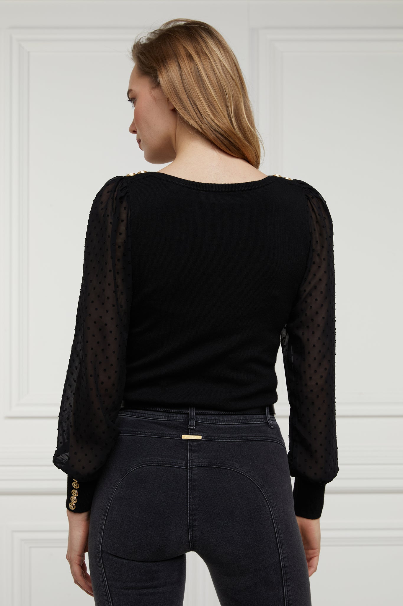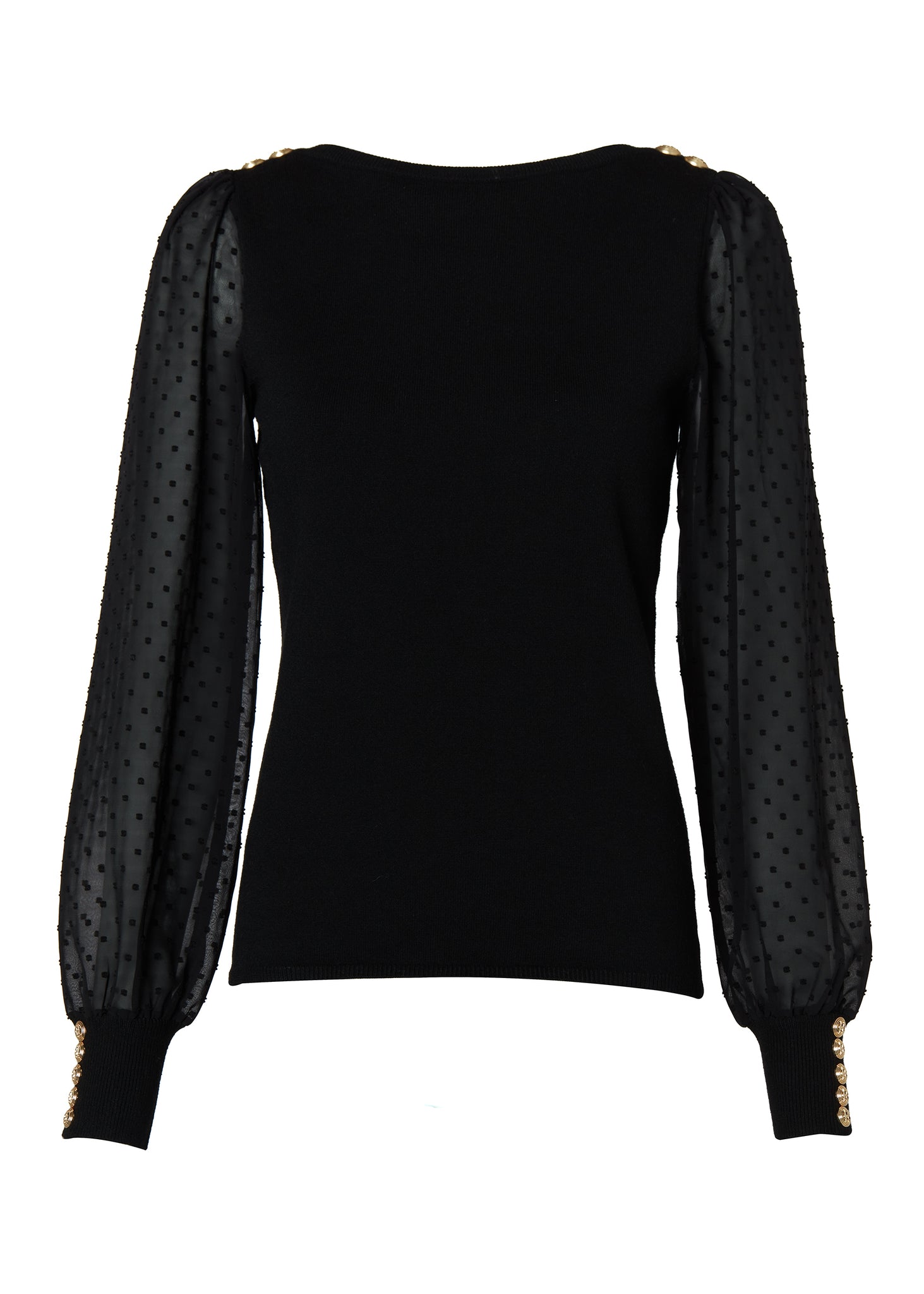 A sophisticated piece featuring a chic boat neck with signature hardware on the shoulders and cuffs. The sheer woven dobby sleeves, finished with rib knit cuffs, add a delicate and stylish touch. Designed with a slim-fit body in a smooth jersey stitch, the Bethany Knit combines elegance and modern flair, making it a perfect addition to any wardrobe.