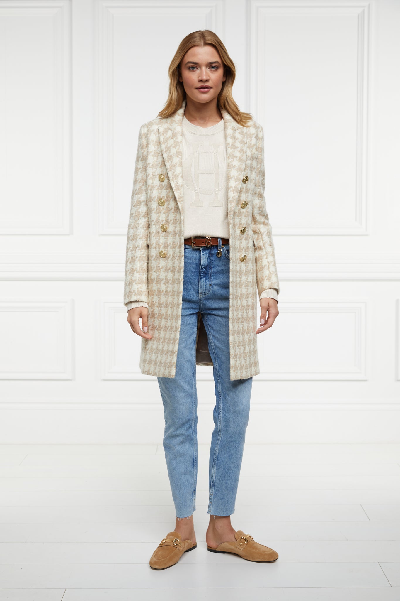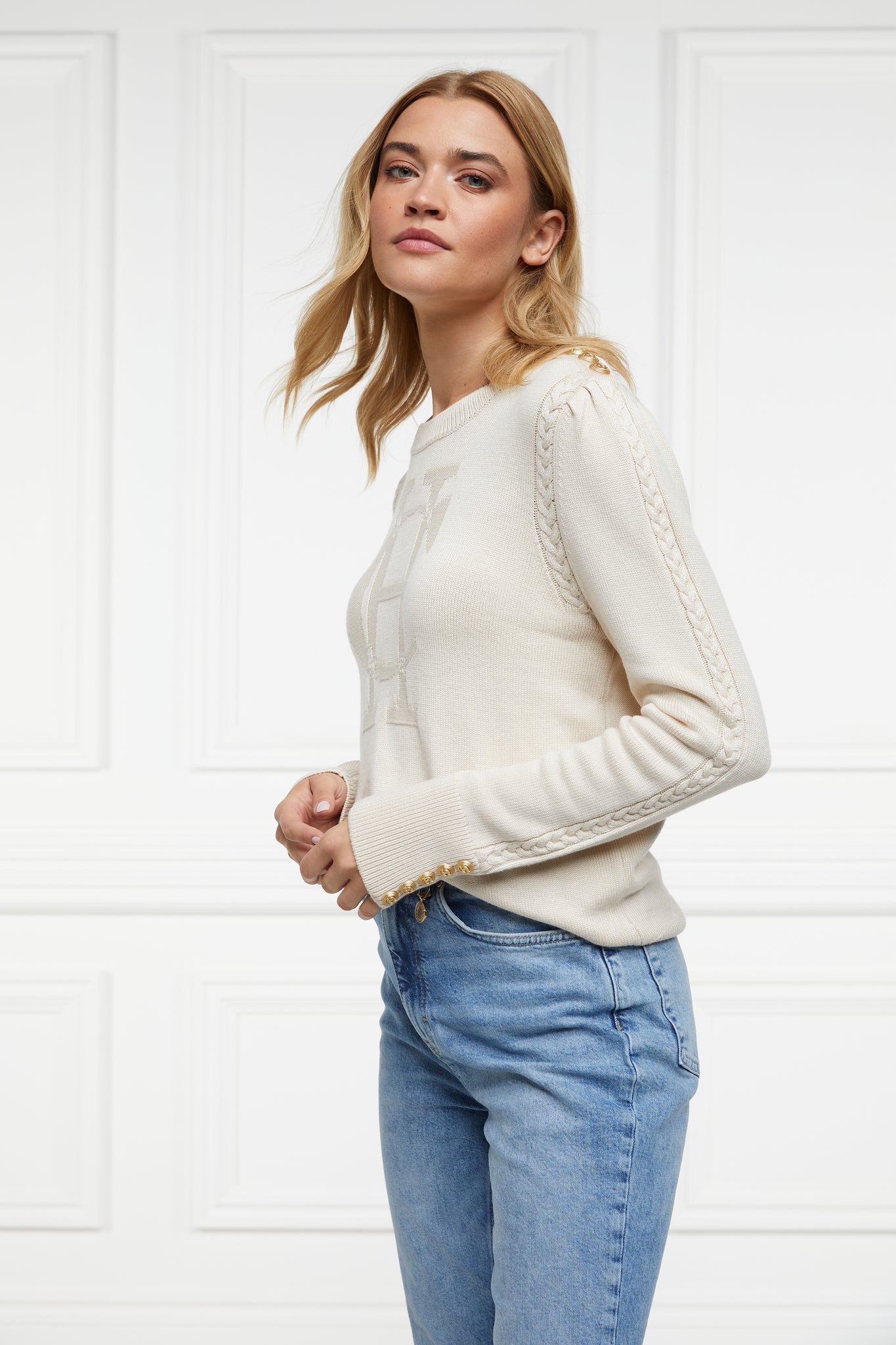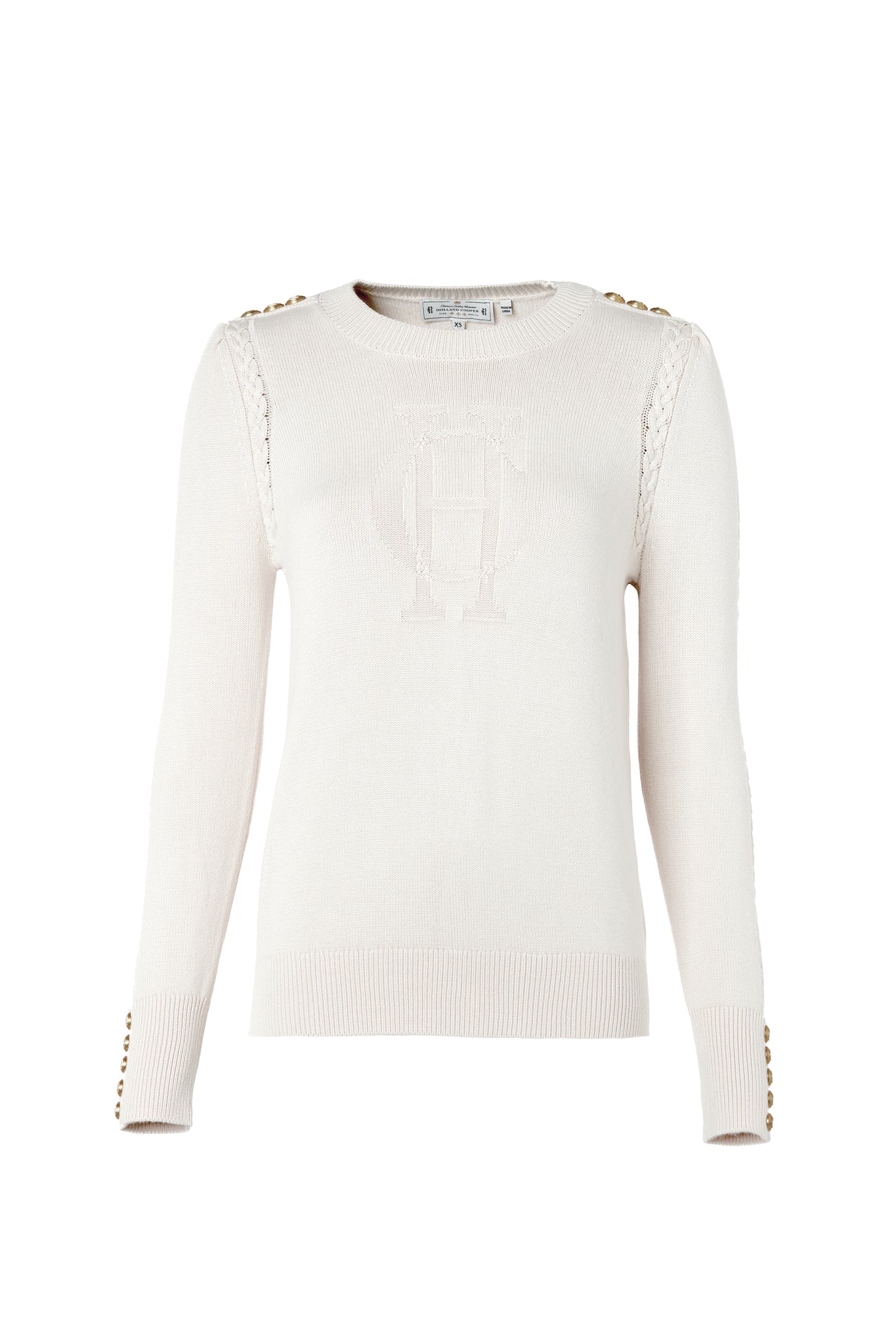Crafted from a sumptuously soft yarn, this jumper boasts an intricate intarsia HC motif and cable pattern on the chest. Designed with a relaxed fit crew neck and slim sleeves, this piece ensures a comfortable and laid-back feel. Accentuated with our iconic gold hardware on the shoulders and cuffs.