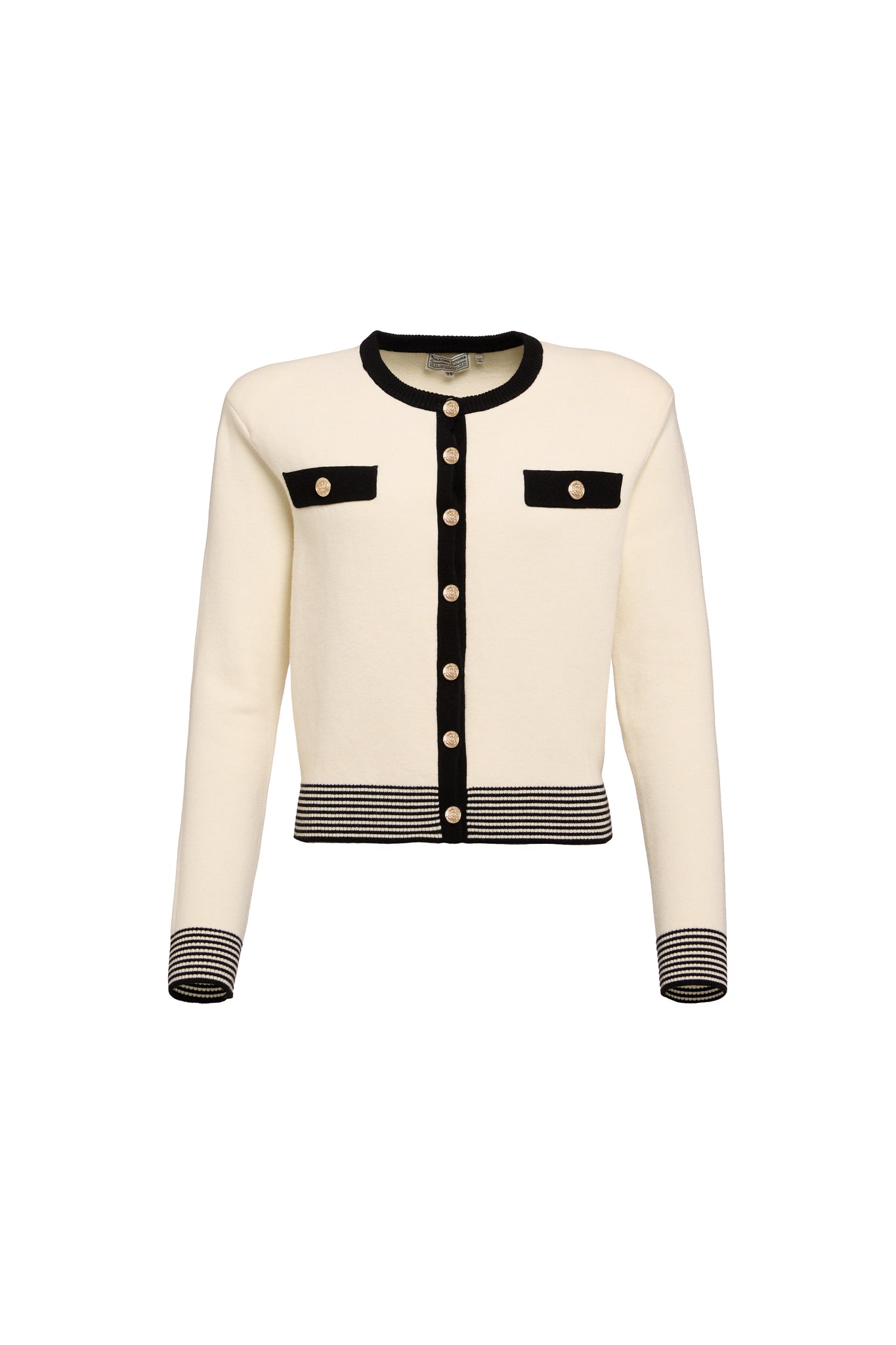 Featuring exquisite contrast detailing and a striking stripe at the hem and cuffs adds a touch of sophistication. The classic crew neck provides a clean and versatile silhouette, while the gold rivets introduce a subtle hint of glamour, making this cardigan a perfect choice for both casual and more elevated occasions.