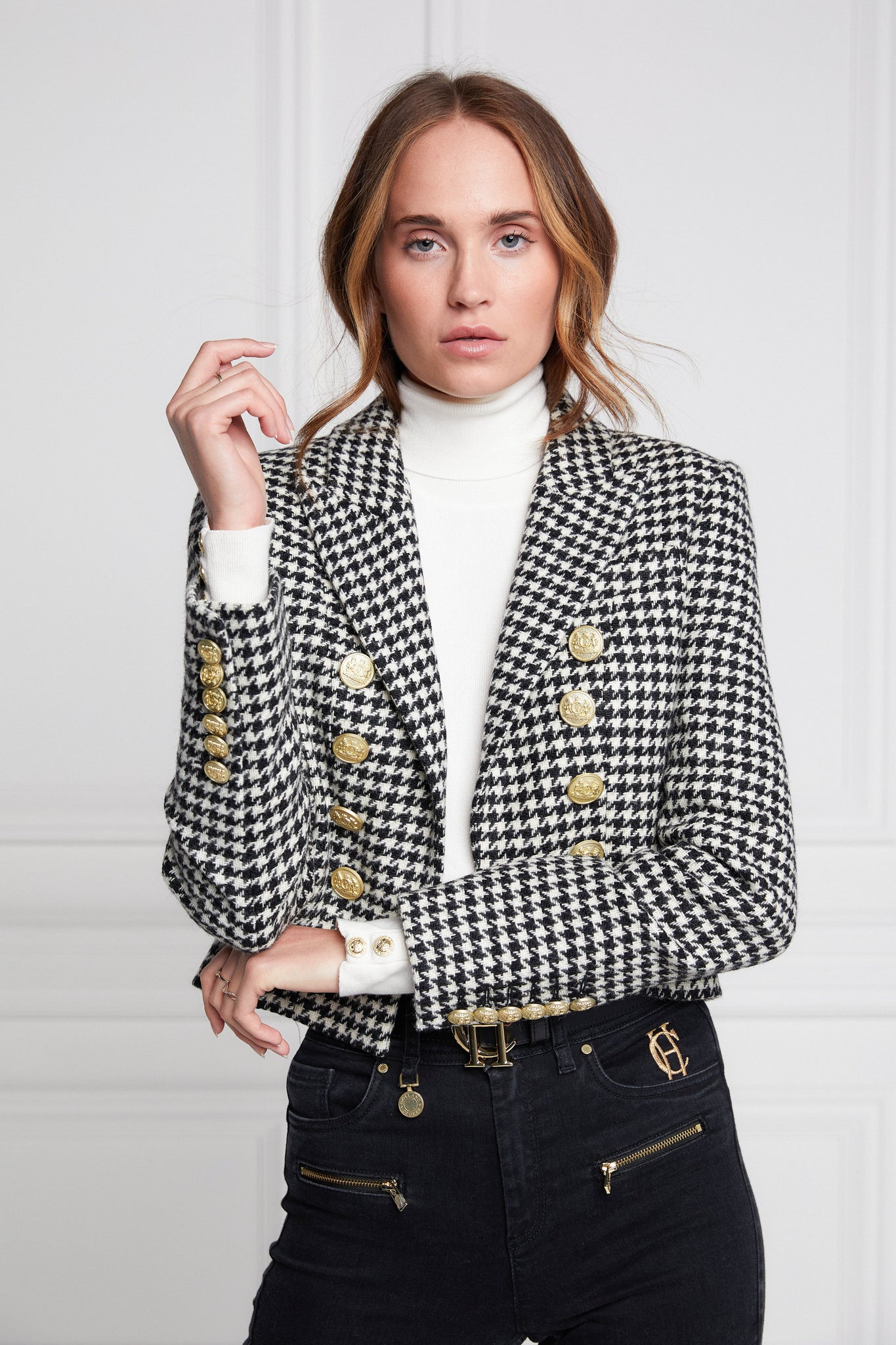 In a contemporary cropped cut, our beautifully tailored Brompton Jacket is the ideal wardrobe staple. Elevated by its statement golden buttons, it is the ultimate trans-seasonal piece. Pair with a lightweight top or an evening dress for instant sophistication.