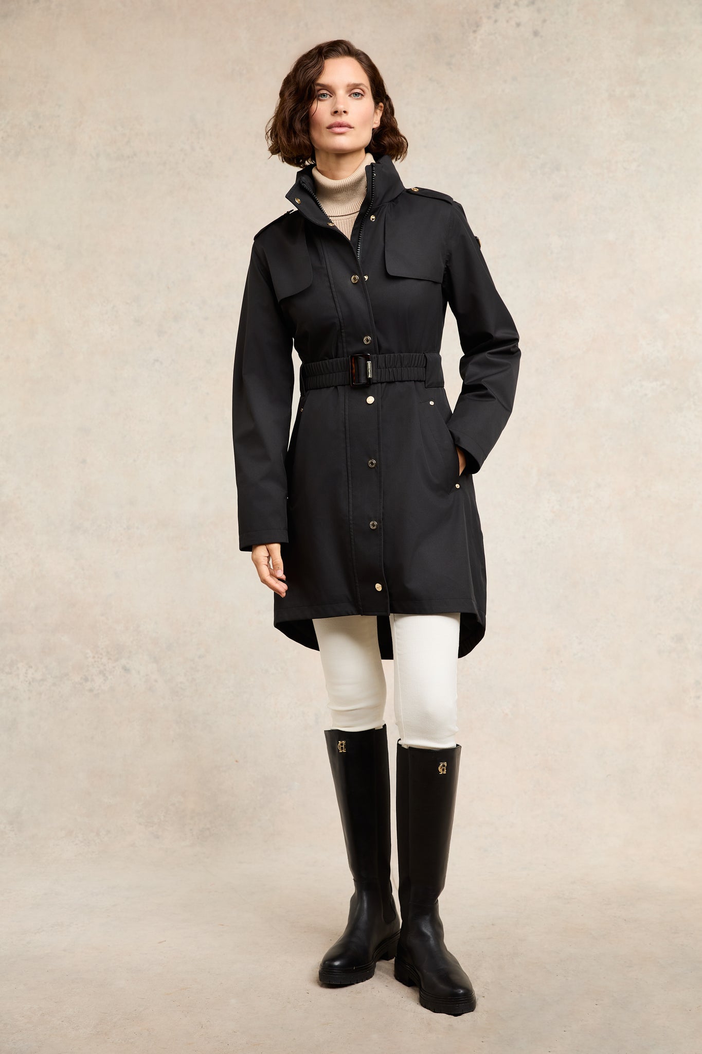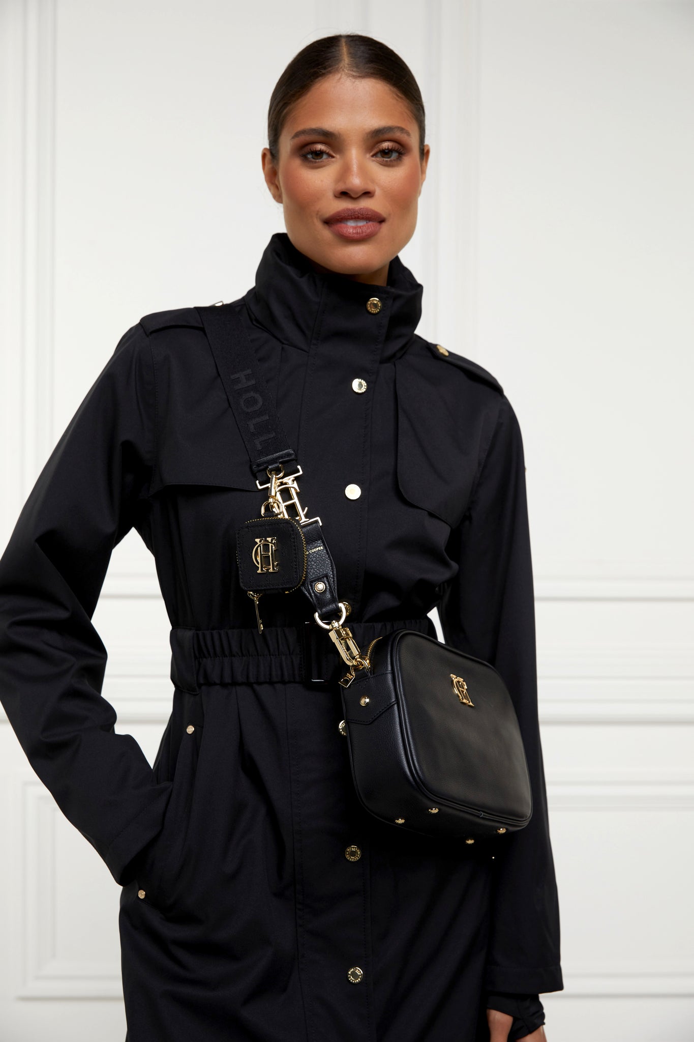 Elevating our bag strap collection, this black webbing strap features elegant jacquard branding and premium PU trims, perfectly complemented by our iconic gold detailing. The Burghley strap also includes a small, monogrammed detachable case with branded dog clips, adding both functionality and style.