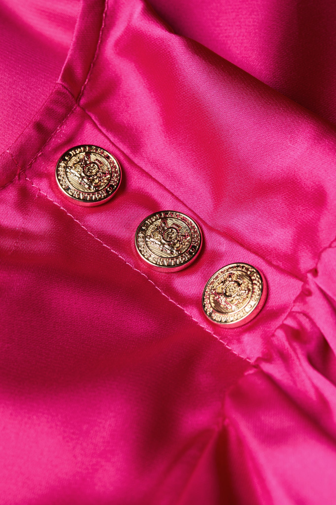 Elevate your wardrobe with the Carmen Blouse. Crafted from lustrous satin, this refined piece combines sophisticated design with statement details. The relaxed silhouette features artfully placed bust darts for a flattering feminine shape, while voluminous gathered sleeves create dramatic impact. Delicate floral embroidery adorns the extended cuffs, secured with elegant loop buttons. A clean crew neckline and discreet gold-hardware zip closure complete this polished design.