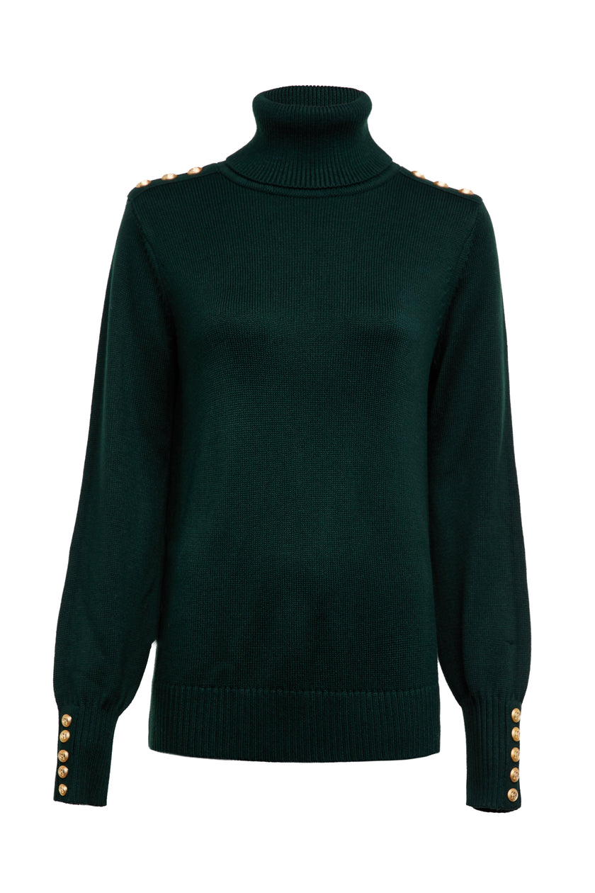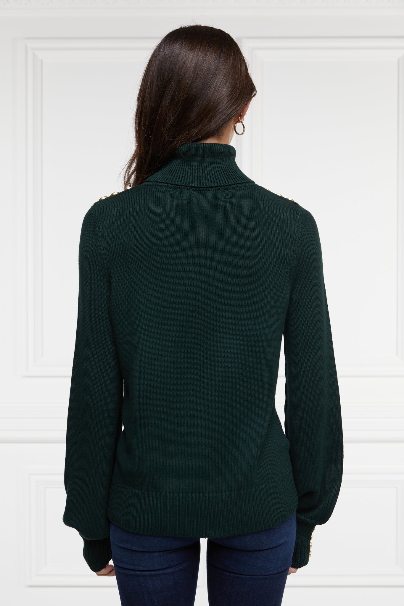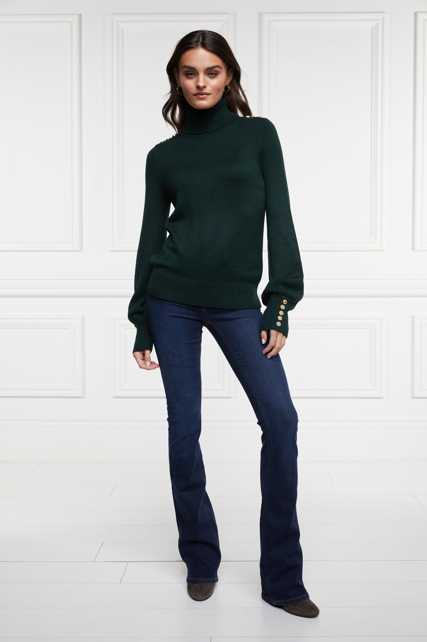 This classic roll-neck knit has been beautifully elevated with subtly fluted sleeves for a soft and elegant look. Made from a luxuriously soft yarn, this knit has been designed with a longer body which is perfect for tucking into jeans. Detailed with our iconic gold HC rivets on the shoulder and cuff.