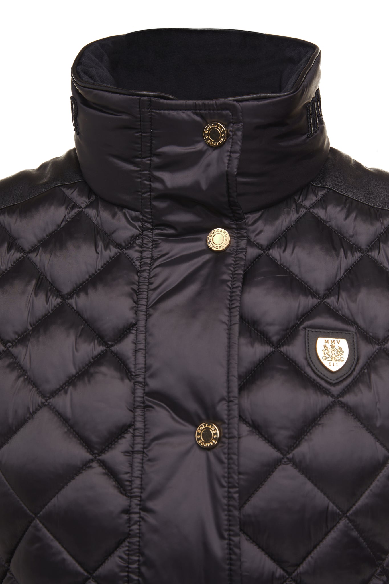 - Burnished faux leather shoulder panels & piping detail to collar