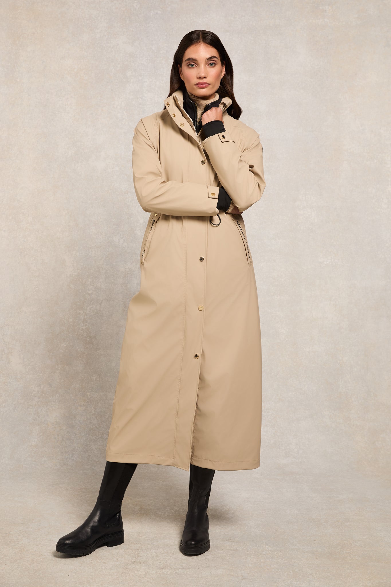 The Chartwell Longline Rain Parka is expertly designed for both style and functionality, offering extended coverage for maximum protection in harsh weather. Crafted from a durable waterproof material and equipped with waterproof zips, this parka is built to withstand the elements. Its classic silhouette, complete with an adjustable waist ensures a flattering fit, while the deep lower welt pockets feature sleek silicone-printed Holland Cooper branding. Finished with matte black coated hardware, this versatile parka effortlessly balances elegance and utility.