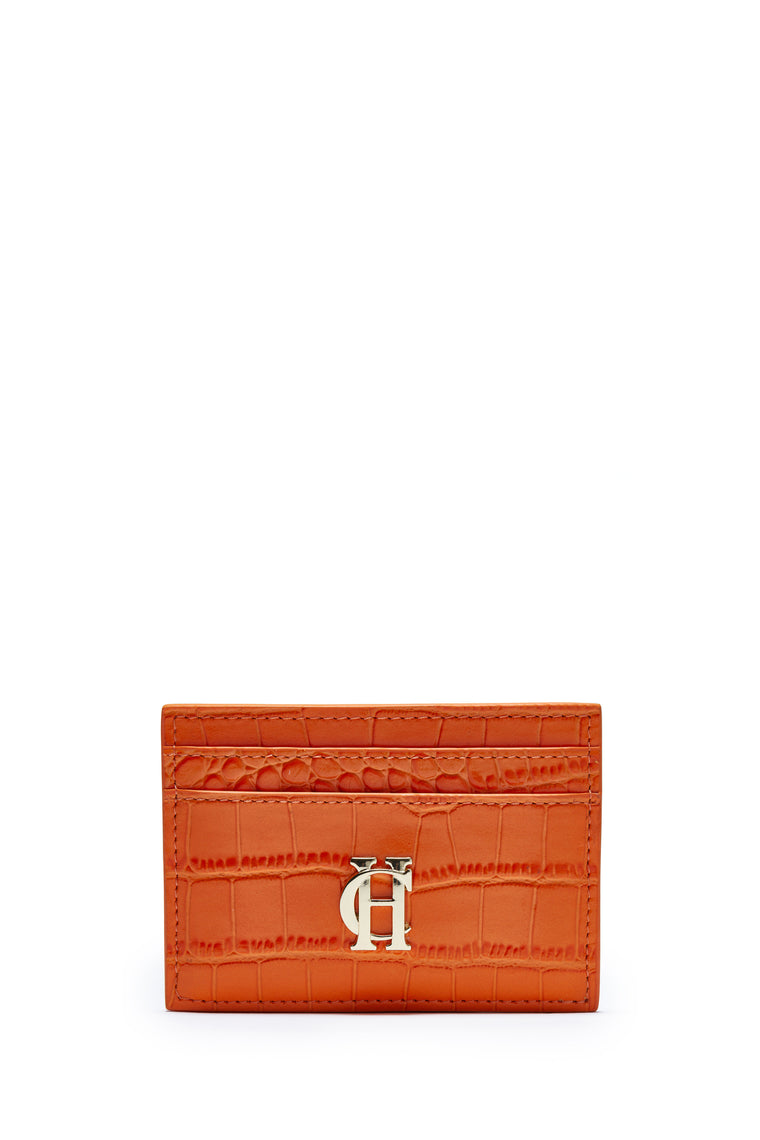 Hand crafted from beautifully embossed leather, this card holder is a sleek alternative to a bulky wallet. With a slim design with four card slots. Elegantly detailed with HC branding and hardware.