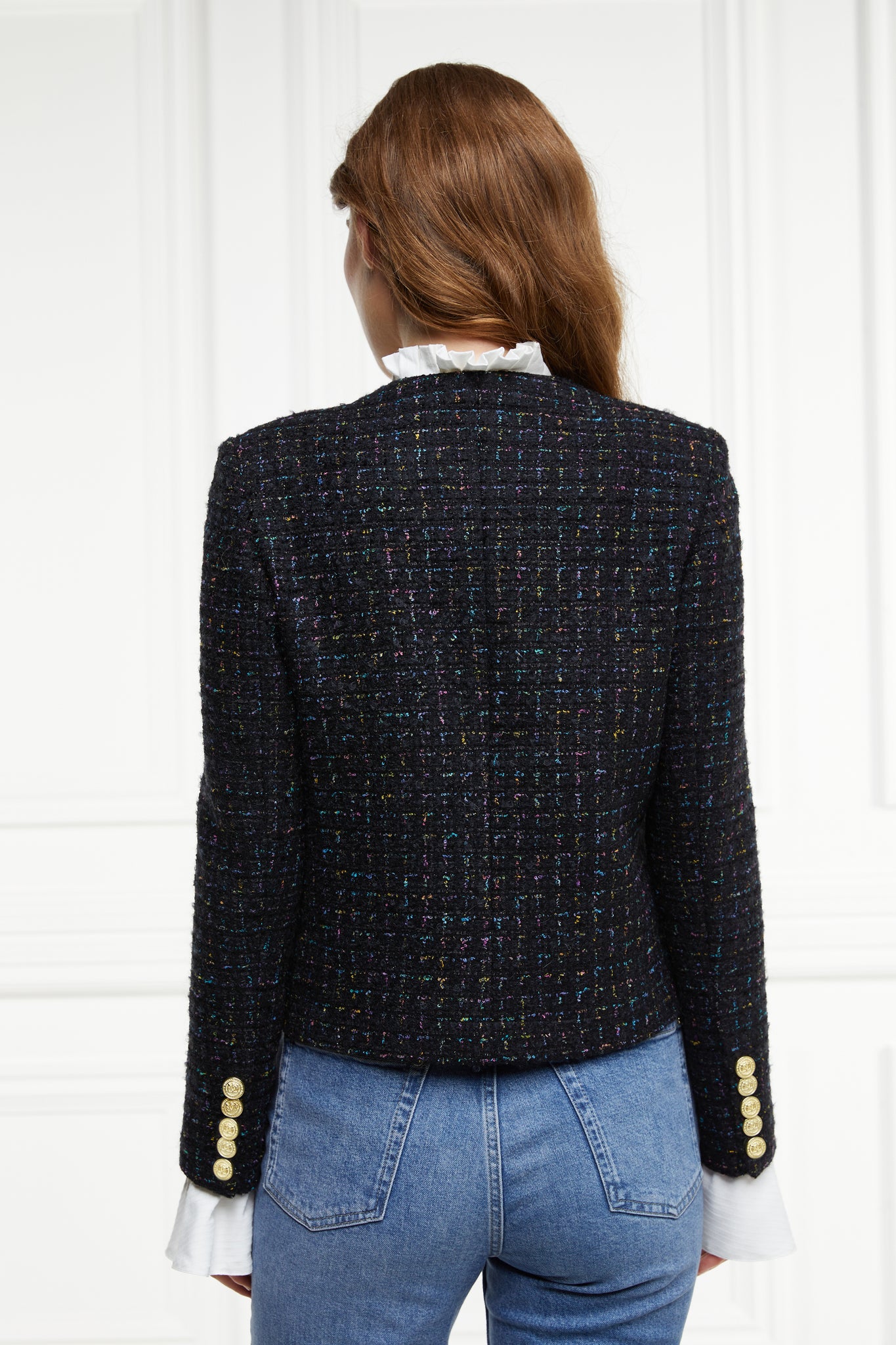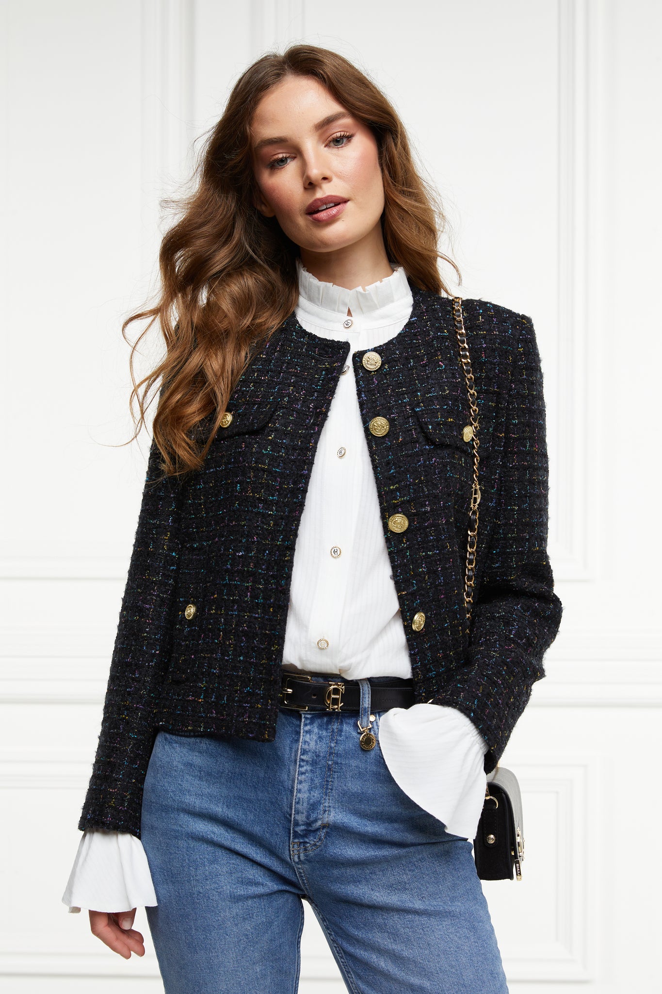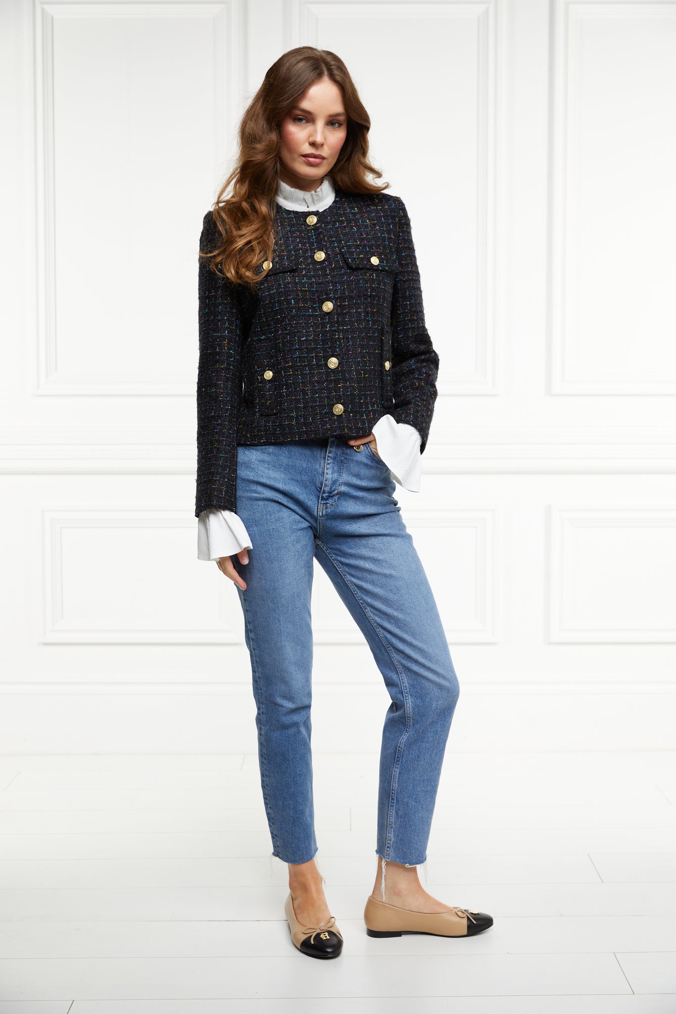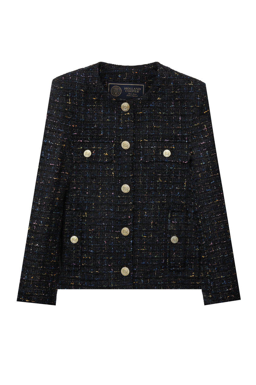 Perfectly blending a modern and vintage aesthetic, this jacket has been crafted with a slightly cropped, easy fit with articulated sleeves. The collarless feature adds a touch of versatility, making it the perfect pairing for shirts, dresses and high-neck tops. Bluff pockets on the chest with fictional pocket flaps, alongside lower side entry welt pockets, enhance its chic aesthetic. Finished with our signature Holland Cooper gold hardware, this jacket seamlessly blends timeless elegance with contemporary flair.