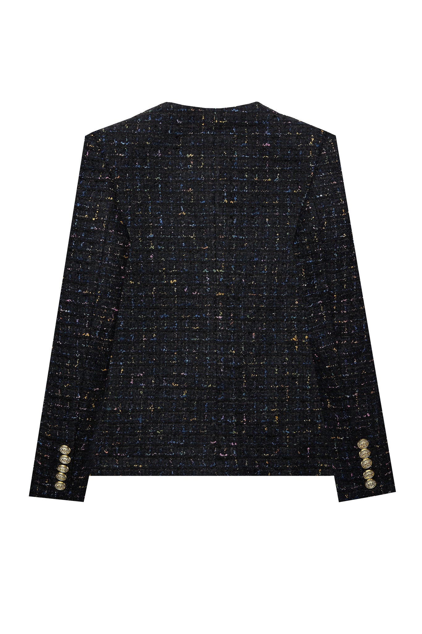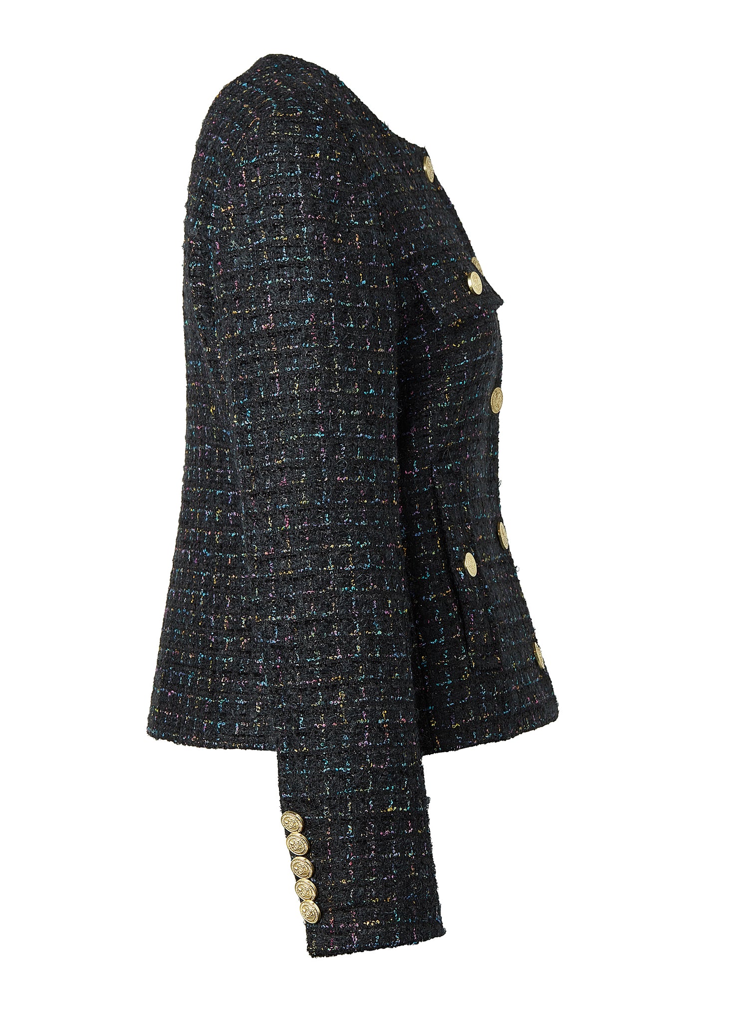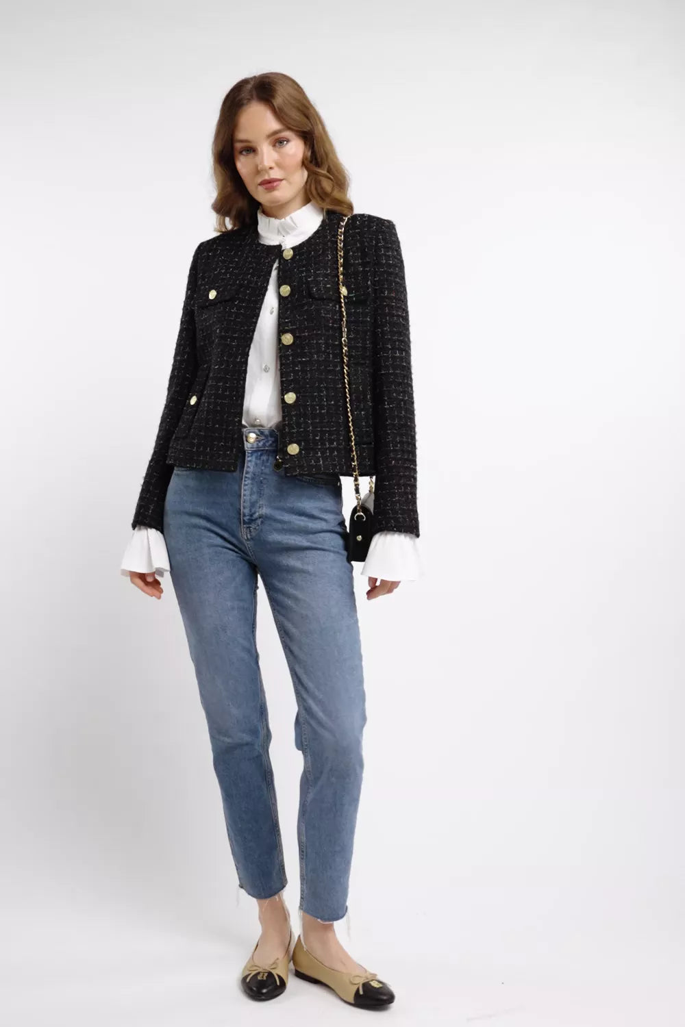 Perfectly blending a modern and vintage aesthetic, this jacket has been crafted with a slightly cropped, easy fit with articulated sleeves. The collarless feature adds a touch of versatility, making it the perfect pairing for shirts, dresses and high-neck tops. Bluff pockets on the chest with fictional pocket flaps, alongside lower side entry welt pockets, enhance its chic aesthetic. Finished with our signature Holland Cooper gold hardware, this jacket seamlessly blends timeless elegance with contemporary flair.
