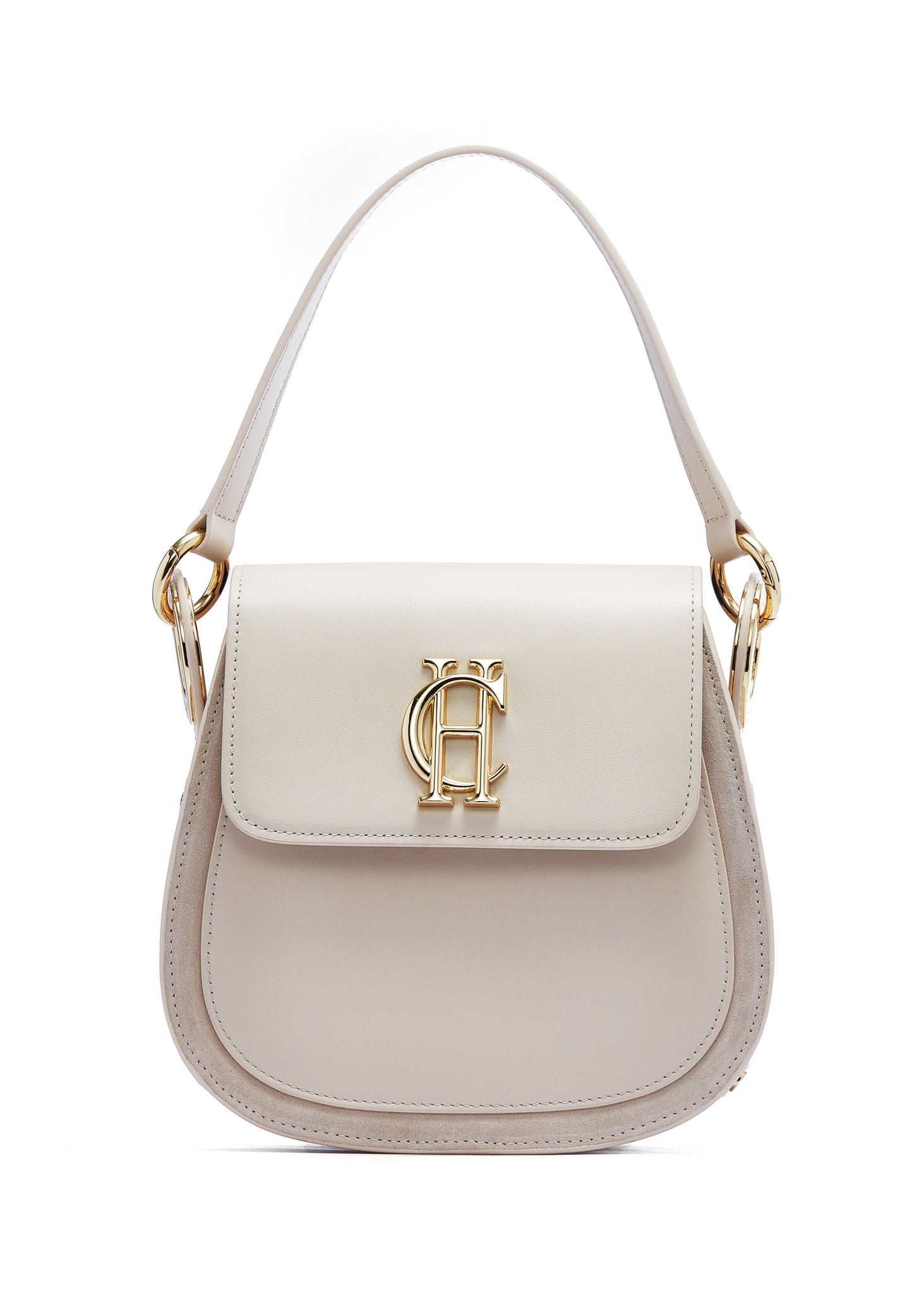 Crafted from an elegant combination of suede and leather, this bag has been designed with a feminine, curved structure. With a spacious interior, ideal for your everyday essentials, the sleek front flap is secured with a magnetic closure to keep your valuables safe. With a chunky top handle and adjustable shoulder strap, this bag has been designed to be worn in multiple ways. Elevated with our iconic gold hardware, HC plaque and gold embellishment.