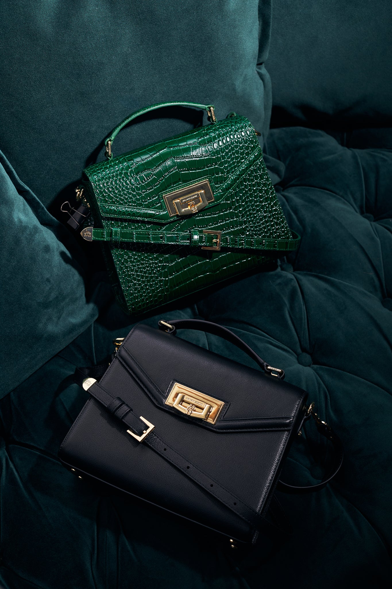 Handcrafted from the finest croc-embossed leather with a compact top handle design, this bag has been beautifully crafted with a vintage, yet contemporary aesthetic. With a detachable cross-body strap with a large internal compartment, the internal zip pocket makes for the safe keeping of your valuables. Synonymous with Holland Cooper, each bag has been elevated with signature gold hardware and a delicate gold clasp.