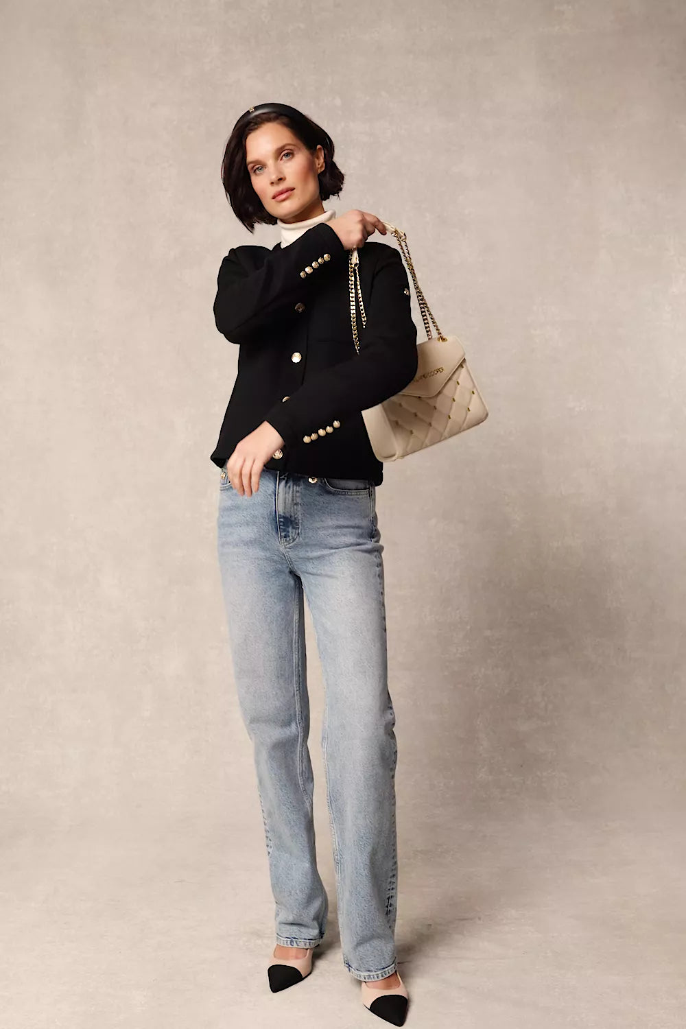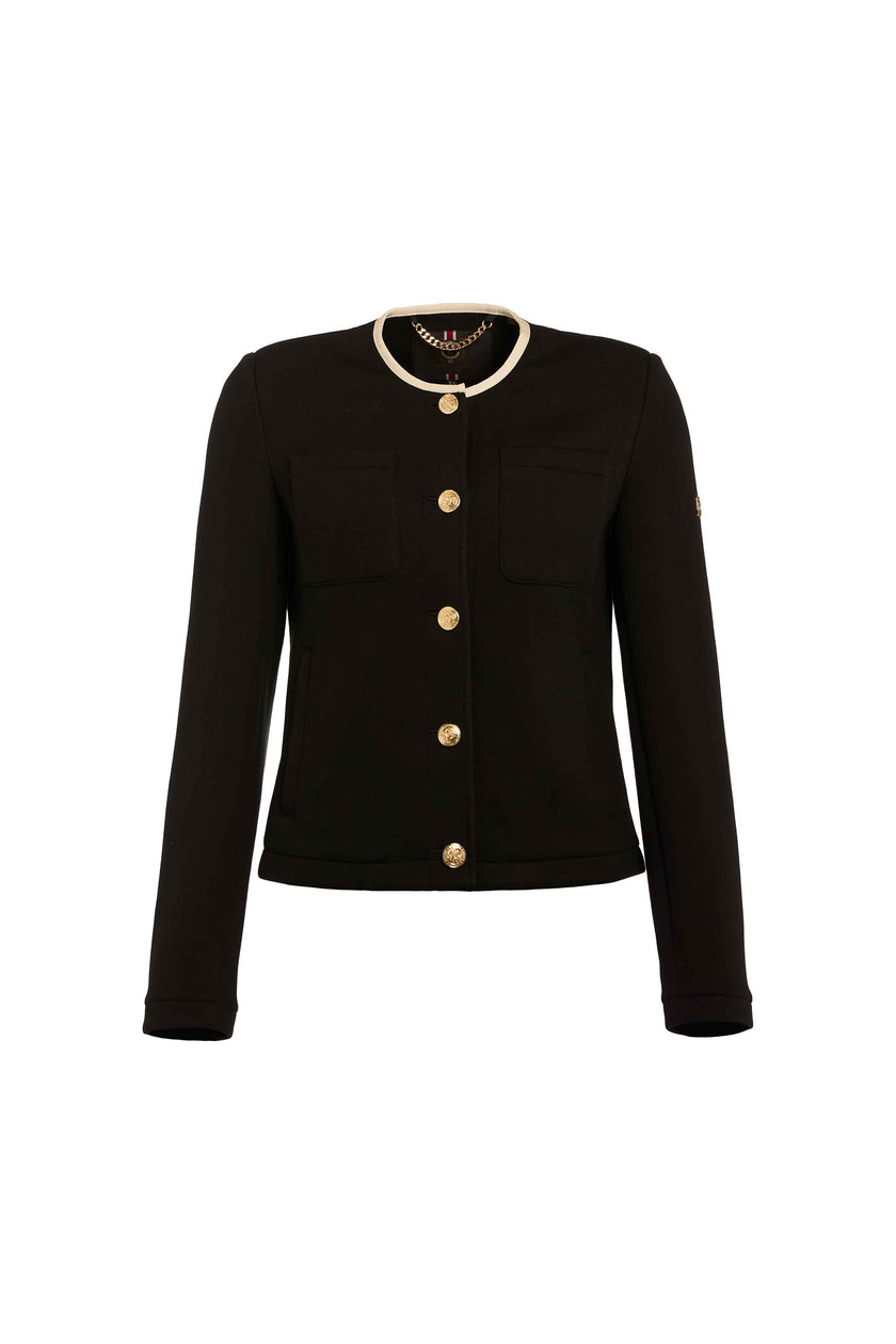 Crafted from luxurious double-face jersey fabric, the Chloe Jacket embodies timeless sophistication. The collarless design features meticulous attention to detail with contrast piping along the edges and five kissing buttons on each sleeve. The cropped silhouette is enhanced by four pockets - two patch pocked at the chest and two vertical welt pockets below. A modern interpretation of our signature Henley Blazer, this refined piece blends comfort with impeccable tailoring.