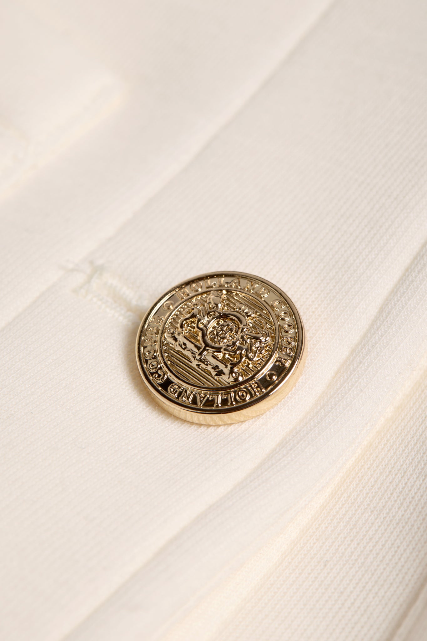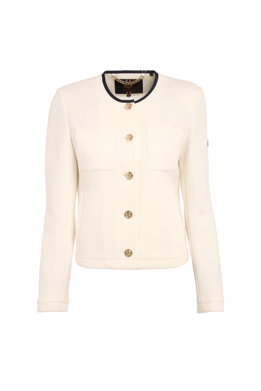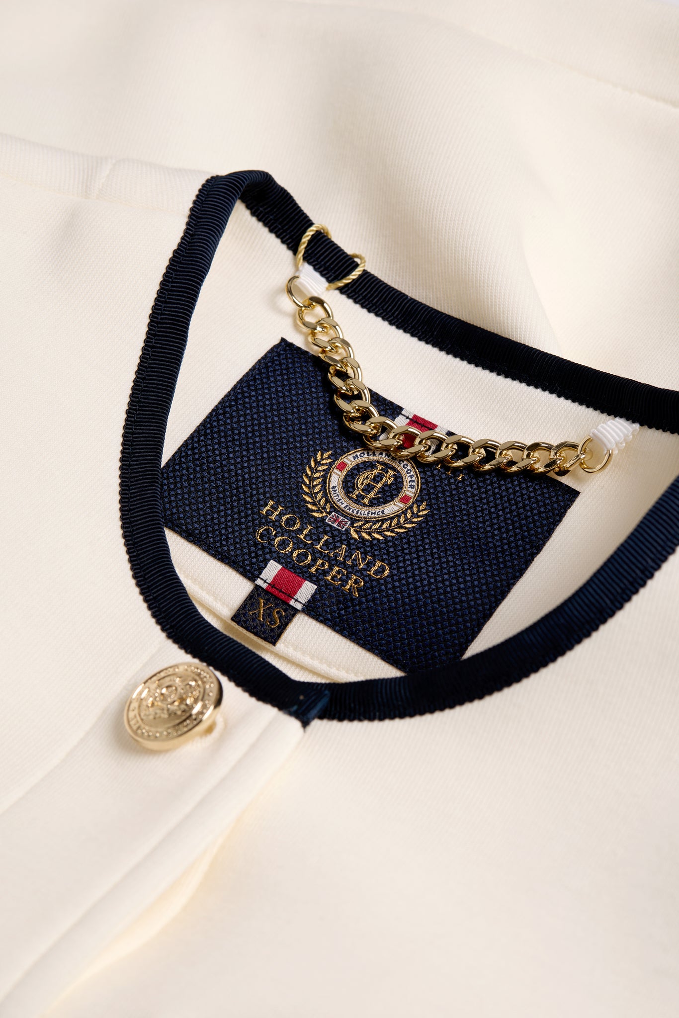 Crafted from luxurious double-face jersey fabric, the Chloe Jacket embodied timeless sophistication. The collarless design features meticulous attention to detail with contrast piping along the edges and five kissing buttons on each sleeve. The cropped silhouette is enhanced by four pockets - two patch pocked at the chest and two vertical welt pockets below. A modern interpretation of our signature Henley Blazer, this refined piece blends comfort with impeccable tailoring.