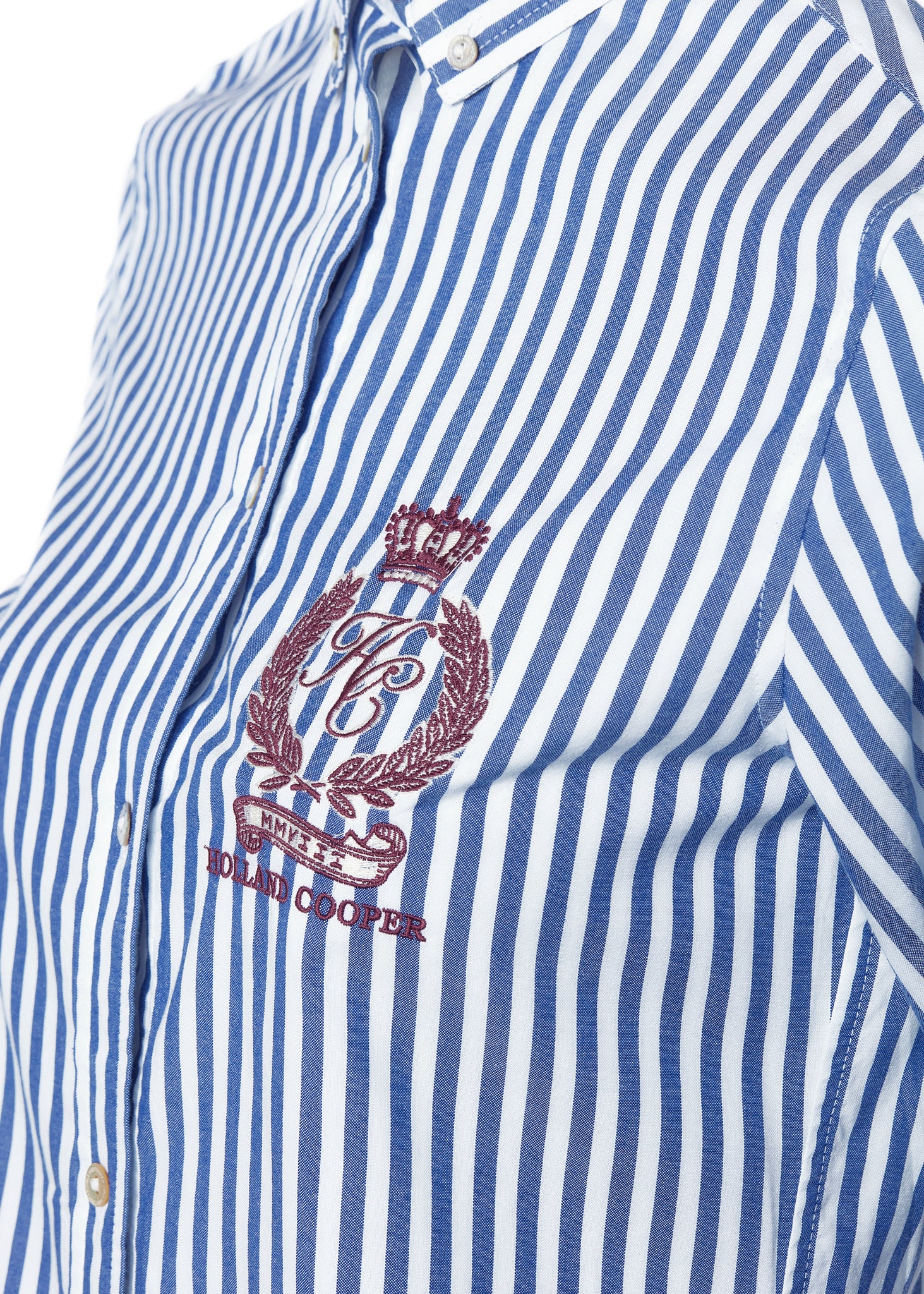 With heritage Oxford button-down styling and preppy yarn-dyed stripes, this shirt is a modern take on timeless sophistication. Crafted from a brushed cotton fabric with a sharp, tailored silhouette, this shirt is a perfect balance of tailored precision and contemporary style. Detailed with delicate crest embroidery to the chest with Jacquard taping to the internal seams. Elevated with branded shell buttons.
