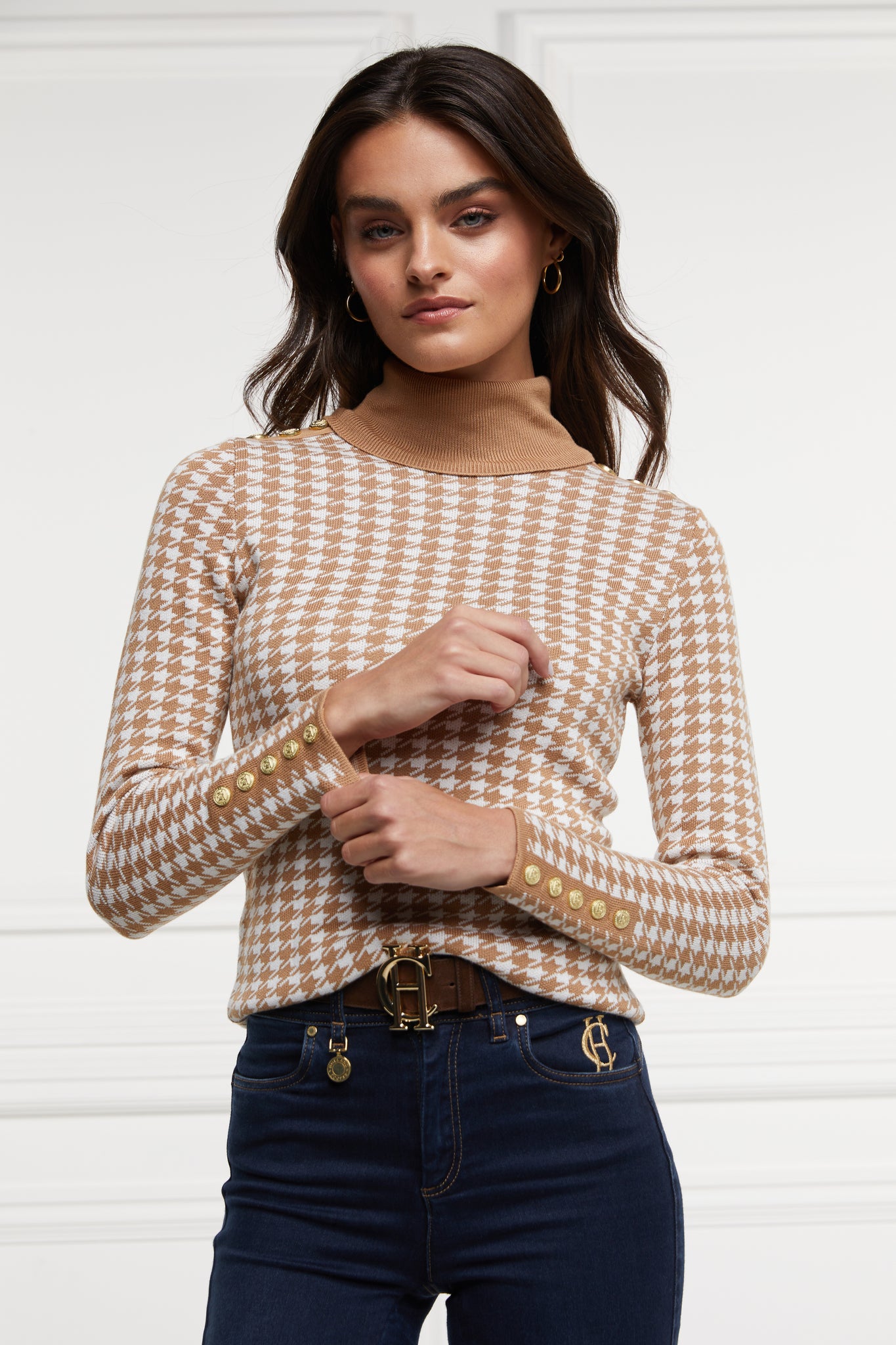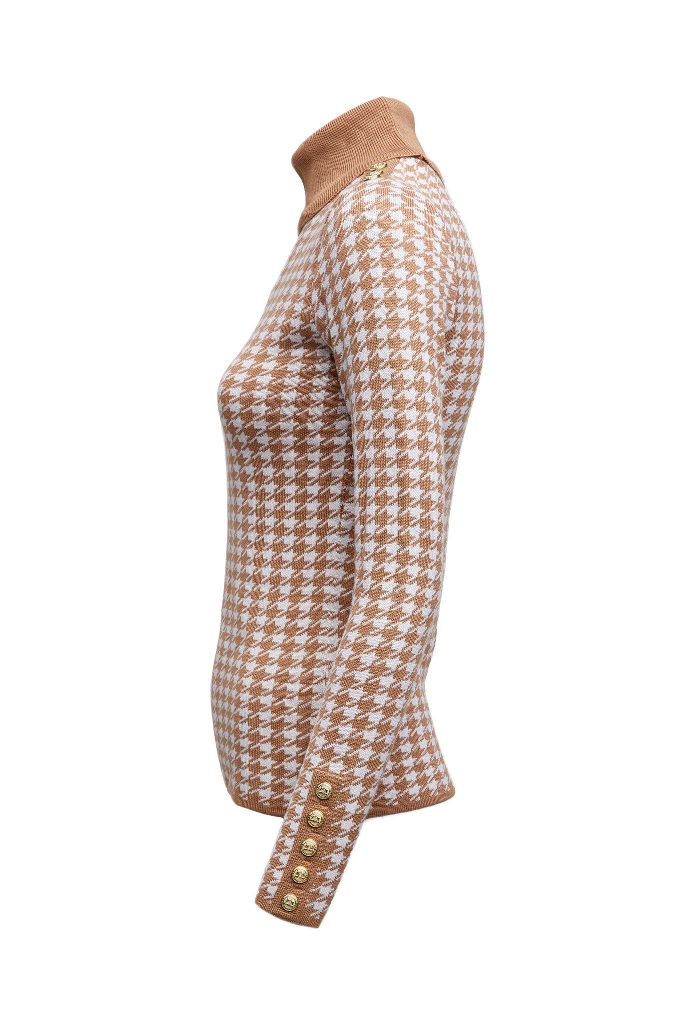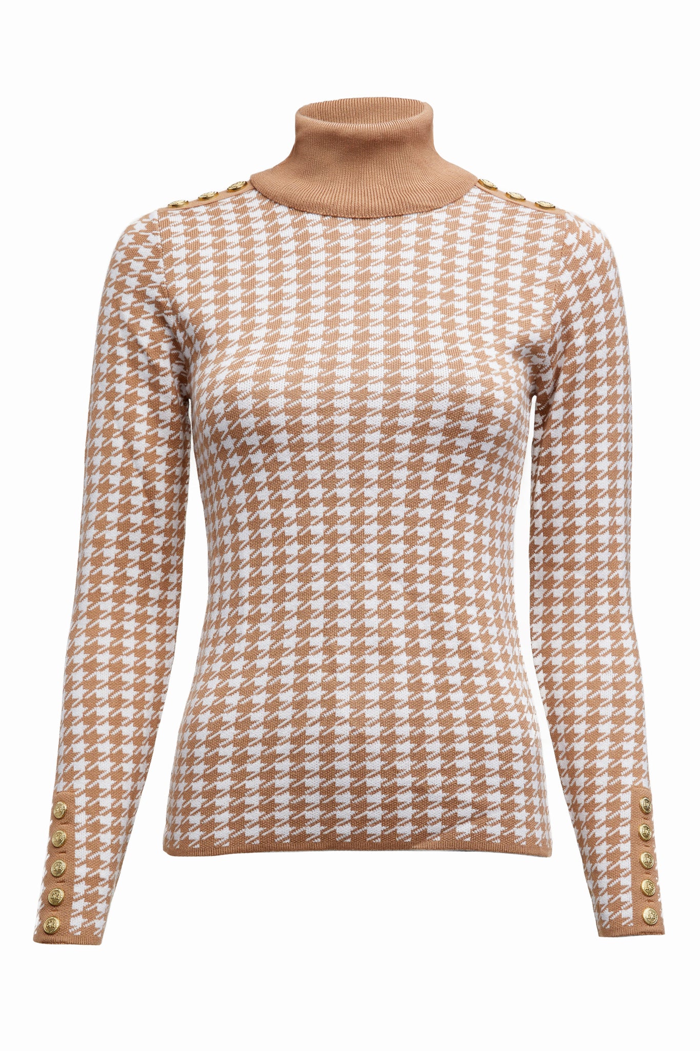 Designed with a slim fit, this ribbed roll neck is made from super soft wool, designed to become an elevated essential for your wardrobe. With a striking classic houndstooth pattern detailed with our iconic gold hardware on the shoulders and cuffs, this knit is perfect paired with our jodhpur jeans for an everyday look.