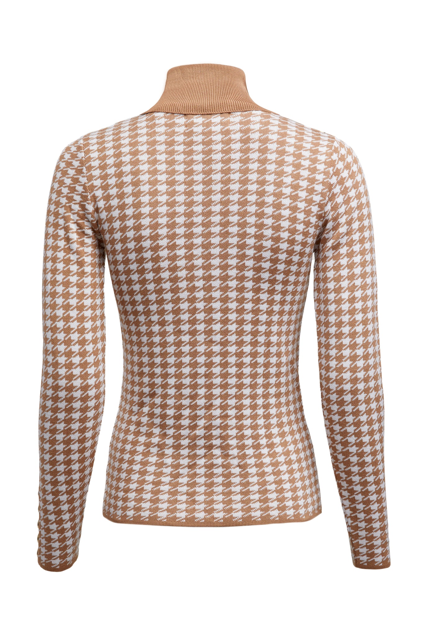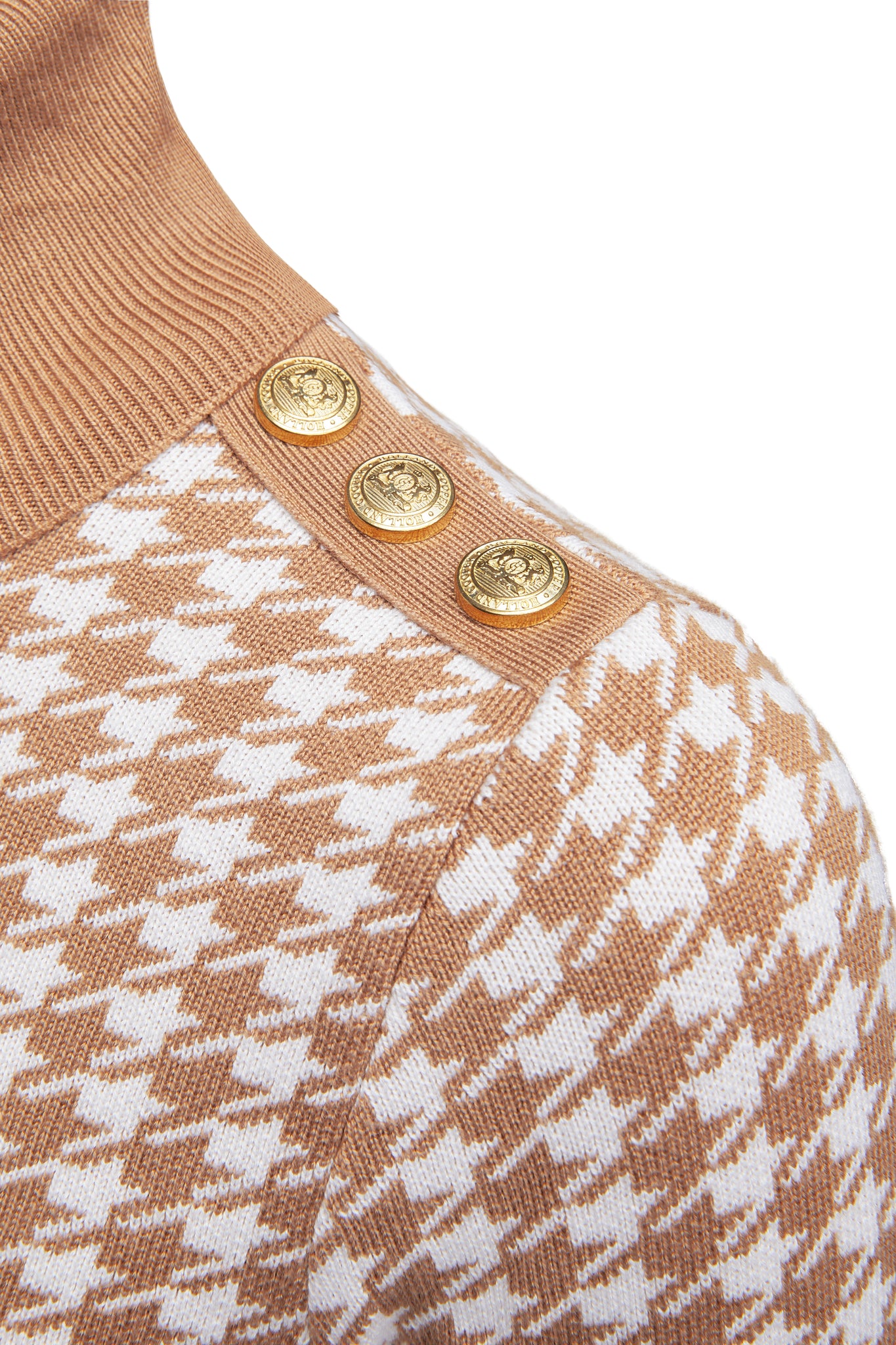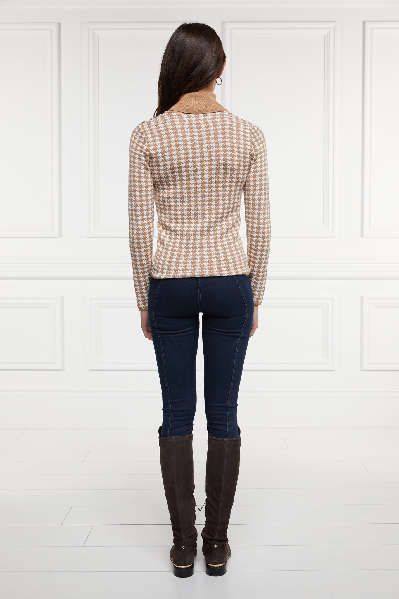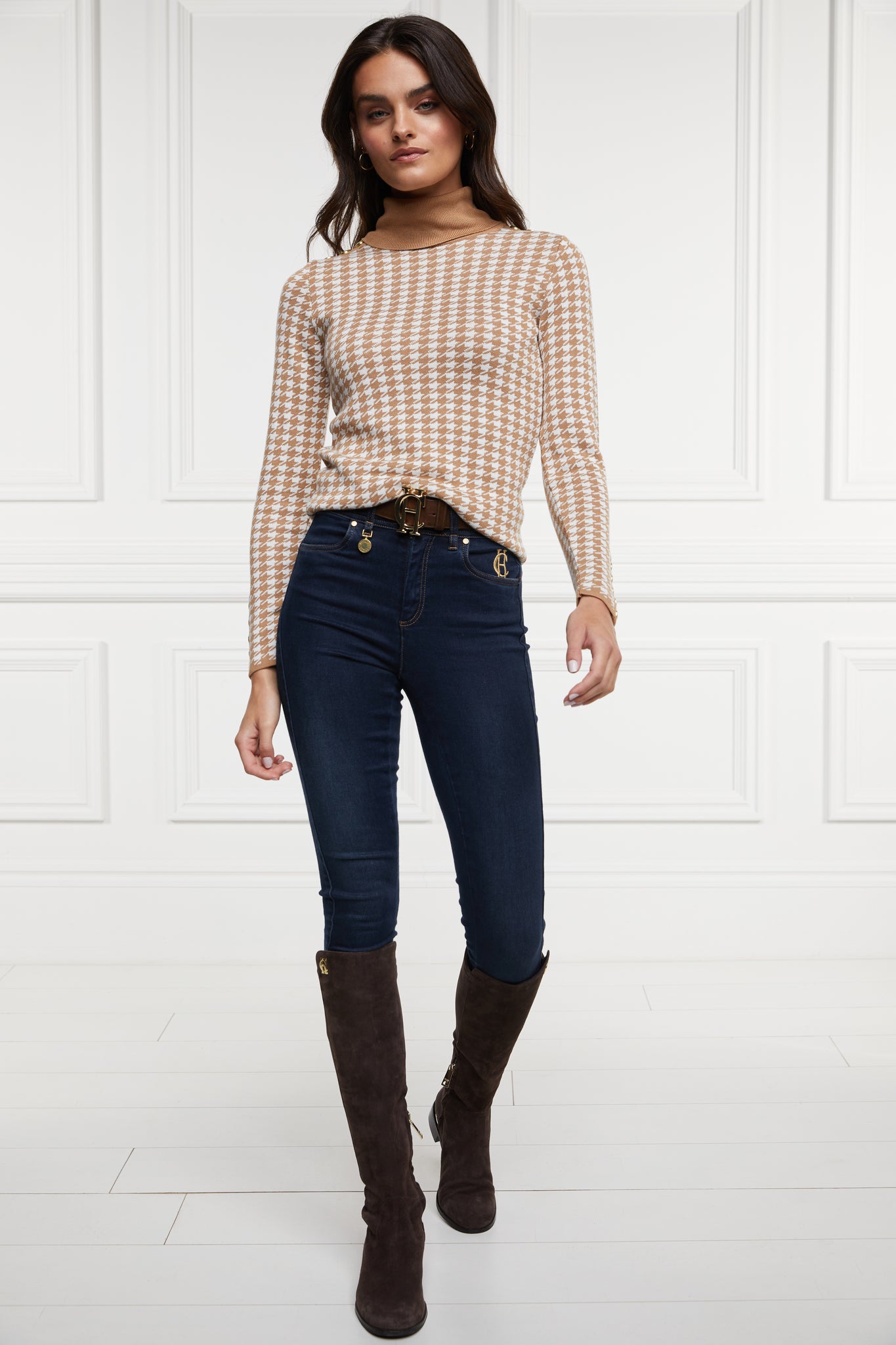 Designed with a slim fit, this ribbed roll neck is made from super soft wool, designed to become an elevated essential for your wardrobe. With a striking classic houndstooth pattern detailed with our iconic gold hardware on the shoulders and cuffs, this knit is perfect paired with our jodhpur jeans for an everyday look.