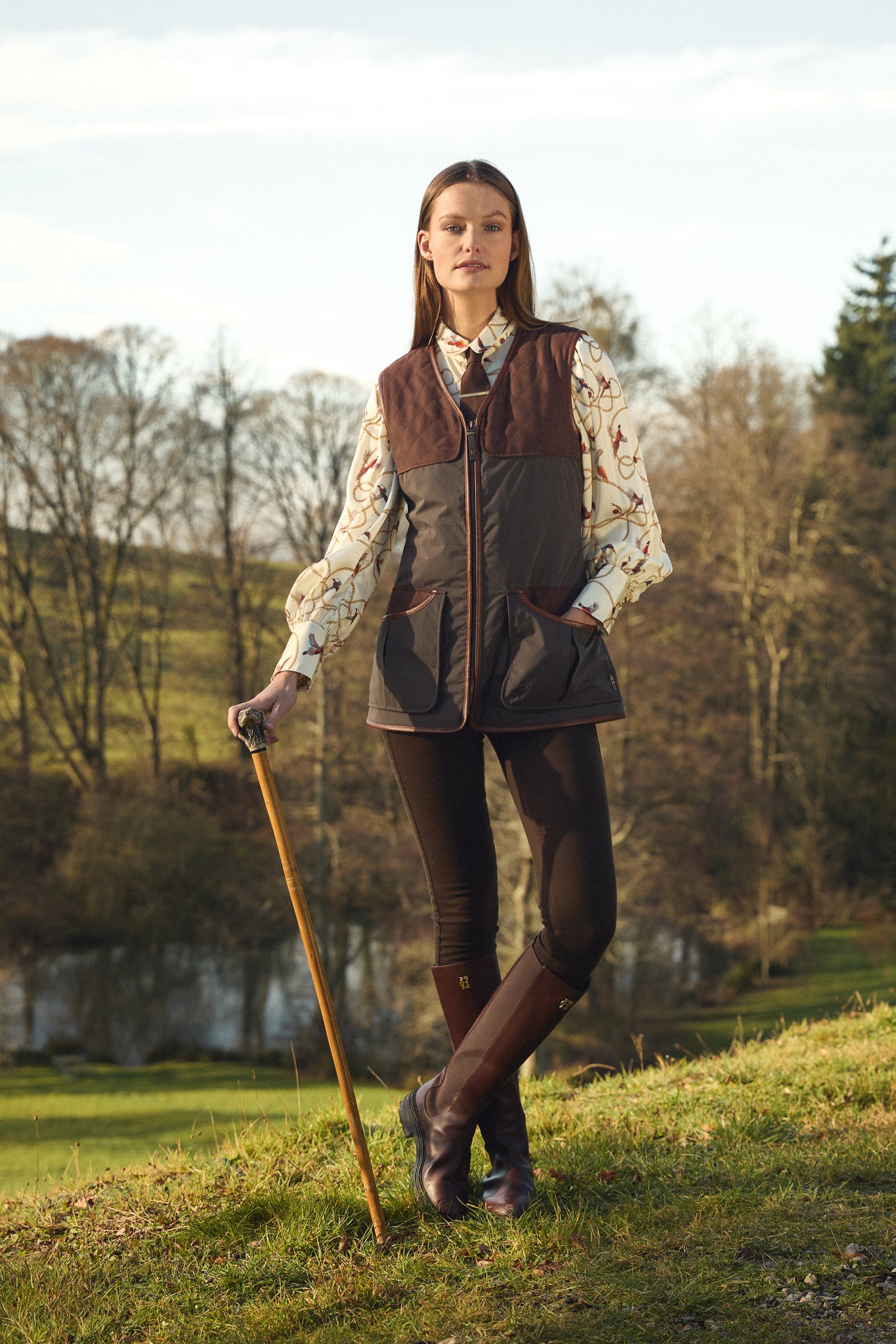 Elevate your country pursuits with our exquisitely crafted Clay Vest in rich chocolate. This distinguished sporting gilet combines timeless tradition with superior functionality, featuring our signature peached microfibre outer shell for unparalleled comfort and durability. Adorned with luxurious faux leather trim details, the vest showcases meticulous attention to detail with bellowed and box-pleated piped pockets, perfectly positioned for swift cartridge access. An elasticated internal waistband creates an impeccably tailored silhouette. Practical yet undeniably sophisticated, this vest epitomises British country elegance.
