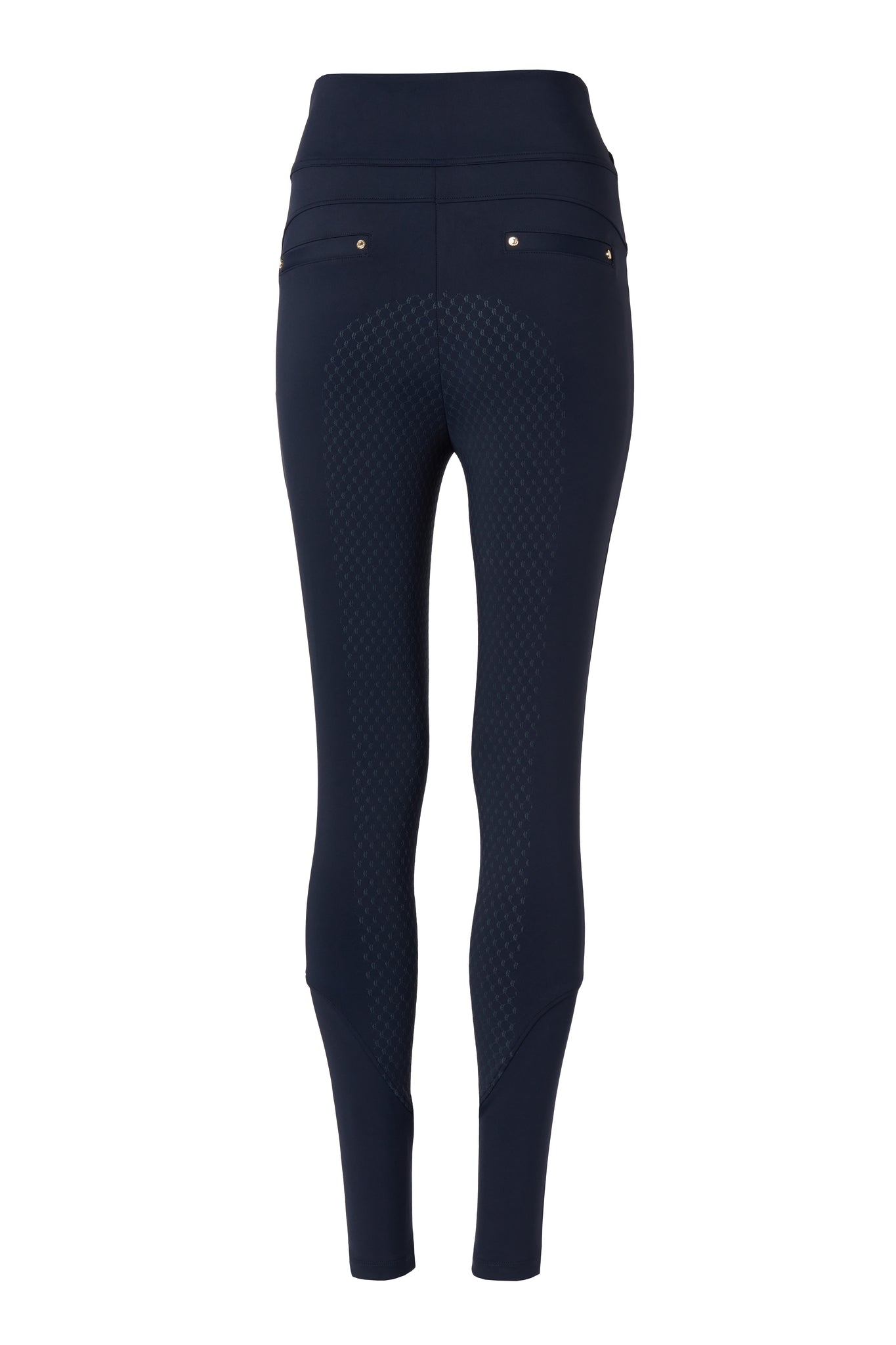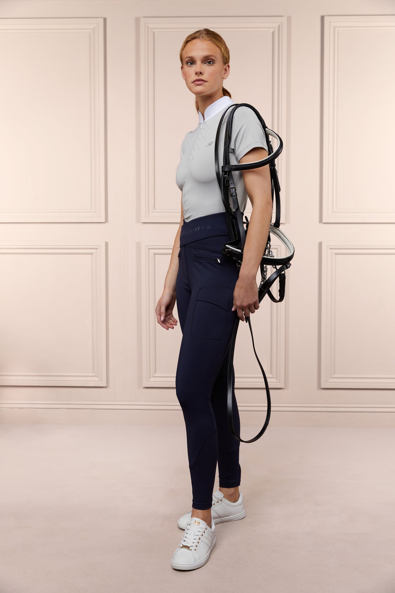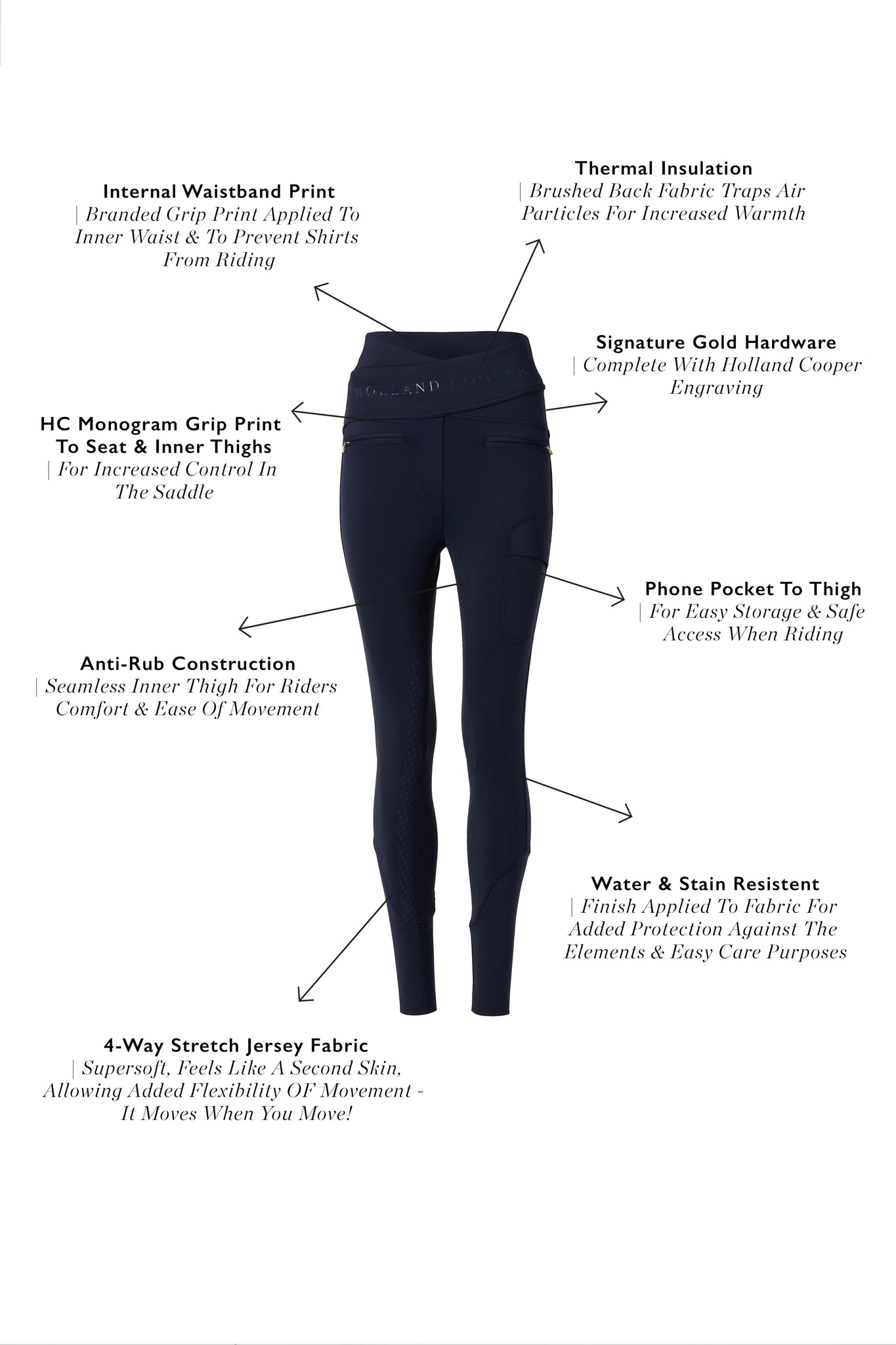 Where performance meets style, our new Cooper Training Breeches have been crafted from a thermal insulated fabric for increased warmth. Providing support and comfort, the branded crossover waistband ensures a secure fit. With grip-printed elastic tape inside the back waistband to prevent shirts from rising, the HC monogram grip print to the seat & inner thigh increases control in the saddle. With a phone pocket on the leg and jetted pockets on the front featuring branded monogram zip pull.