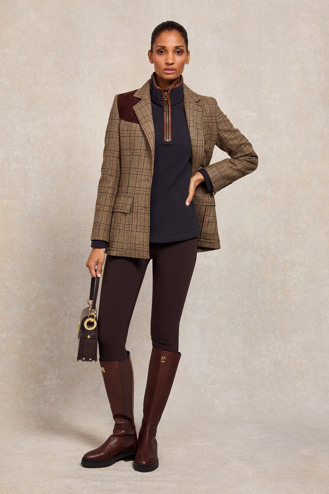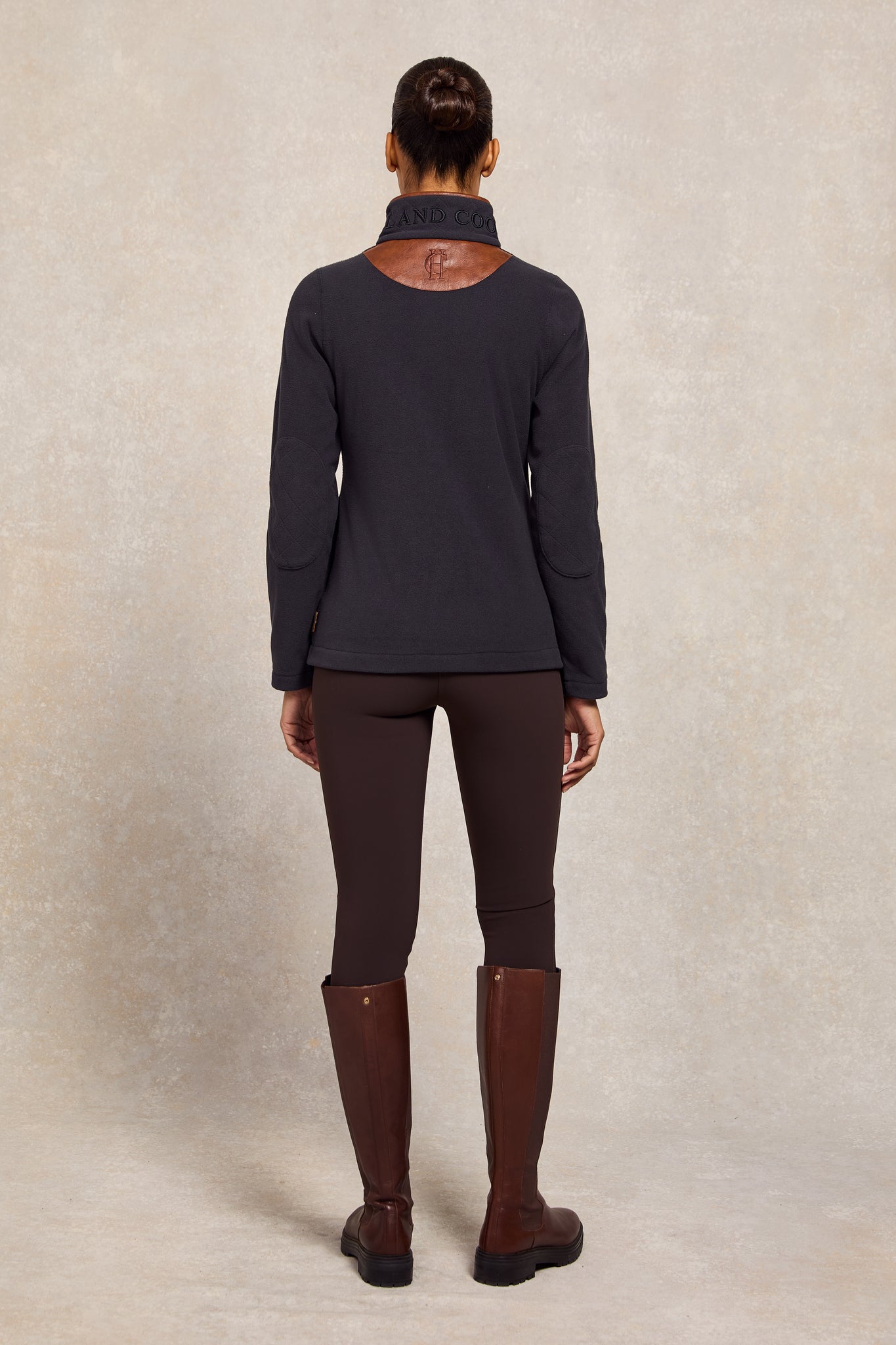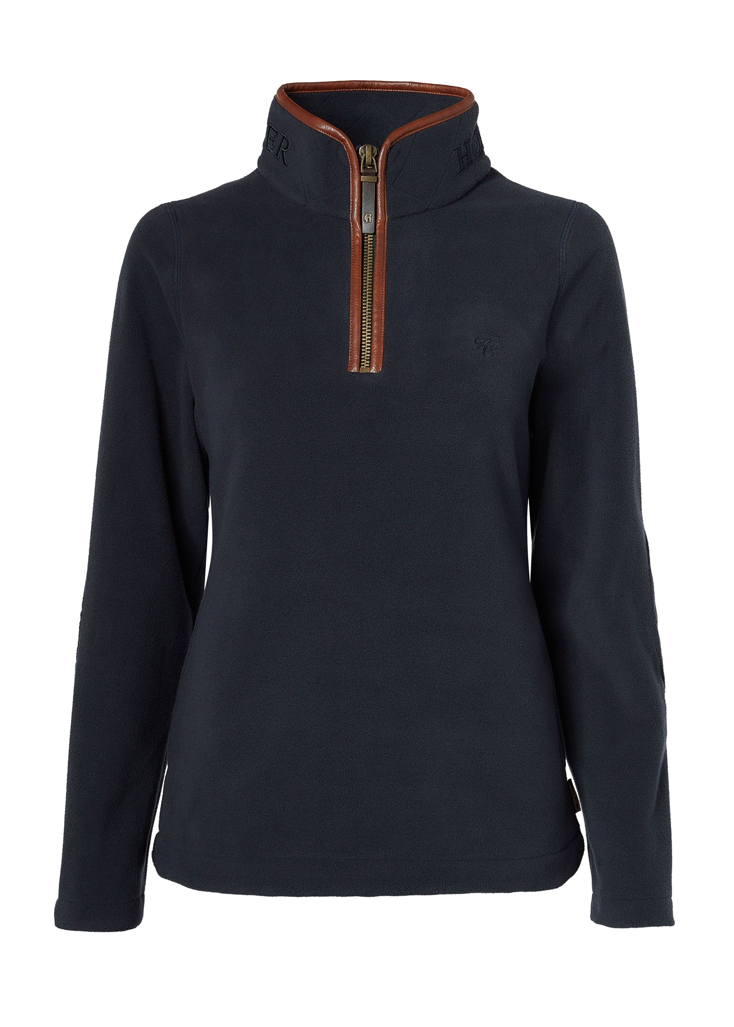 Detailed with faux leather piping and subtle HC embroidery to the chest, the hidden seamed pockets ensure a smooth and clean fit when worn. Elevated with contrasting embroidered back yolk and fleece elbow patches. Finished with our iconic antique brass fastenings and metal hardware.