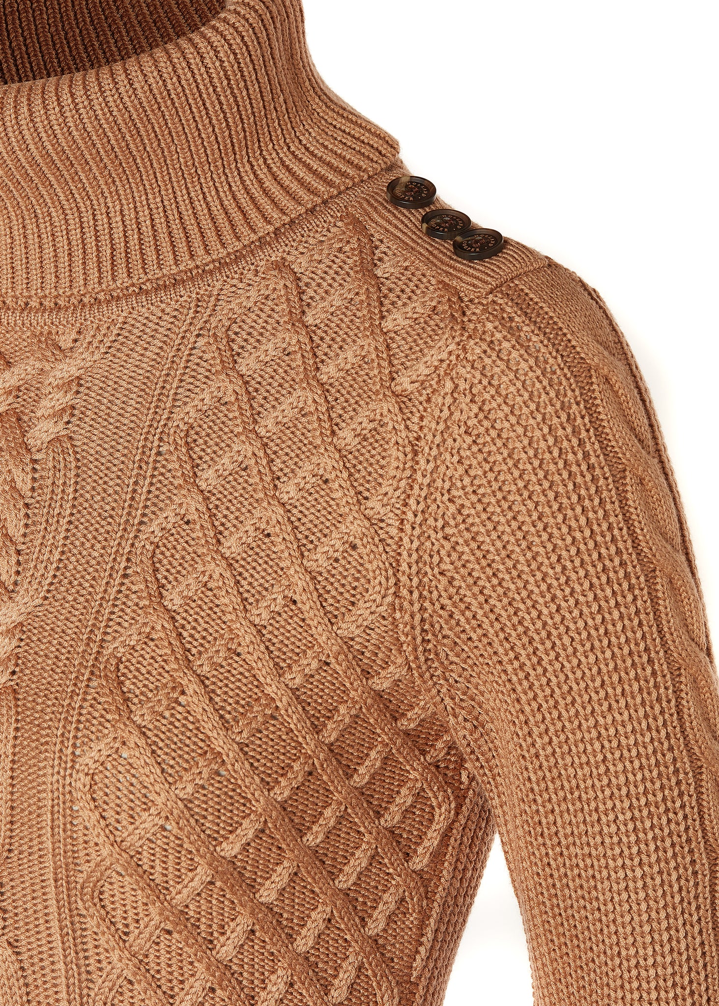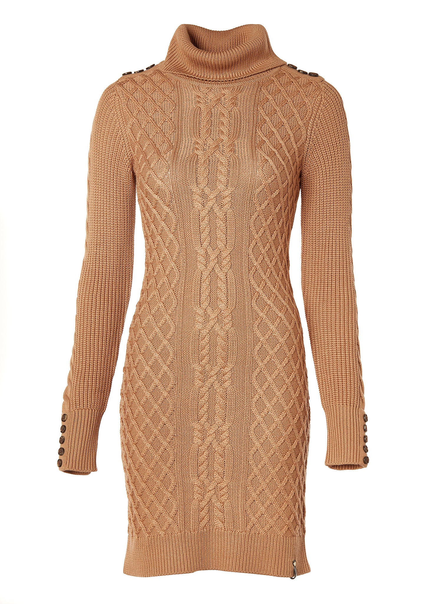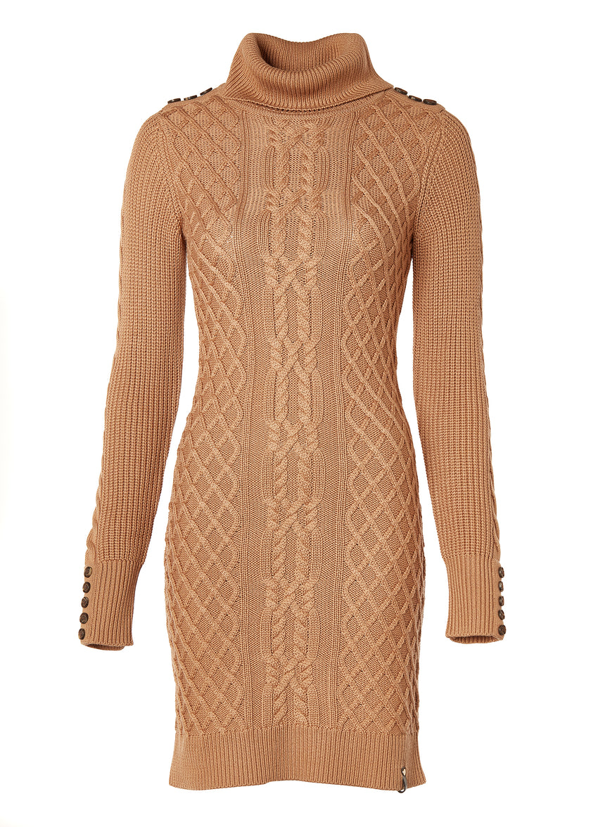 This dress is the perfect blend of classic charm and modern sophistication. This mini-length dress features a cosy ribbed roll neck collar and cuffs, ensuring warmth and comfort. The exquisite cable knit pattern adds a touch of timeless texture, accentuated with horn buttons, this dress embodies both style and practicality.