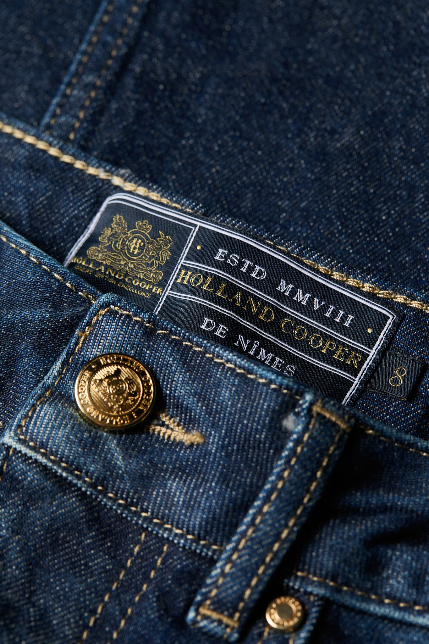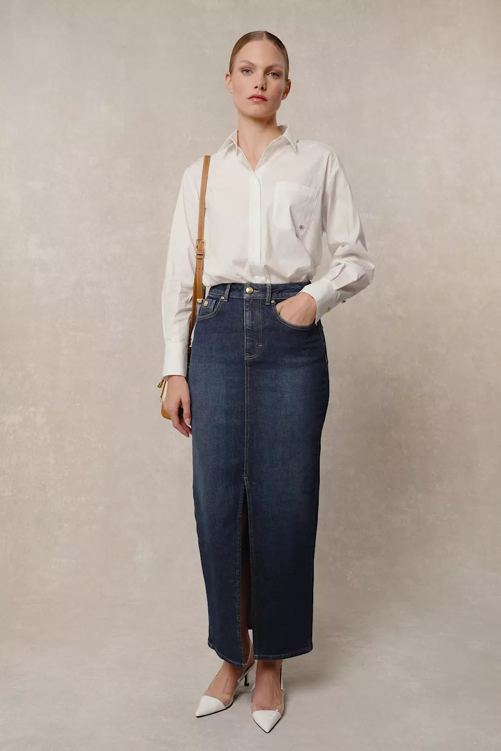 Crafted from beautiful soft cotton fabrics, the comfort stretch material ensures ease of movement and all-day comfort. The open-vented front adds a modern touch, while the classic five-pocket styling and signature gold metal hardware provide timeless appeal. With classic denim detailing and a knee-length finish, this skirt seamlessly combines elegance and versatility for any occasion.