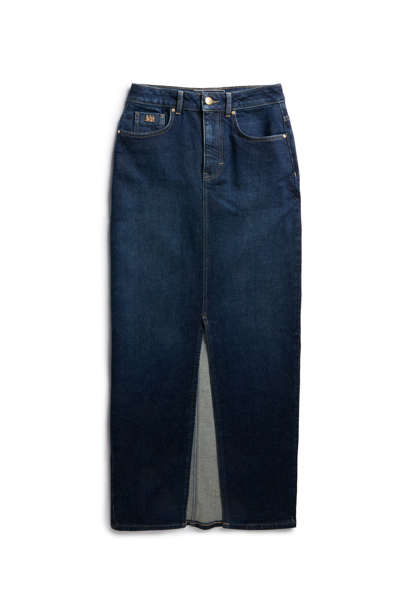 Introducing our first High-Rise Denim Maxi Skirt, a sophisticated addition to your wardrobe. This skirt features a high-rise fit at the waist and a slim line through the hips and legs, creating a sleek and flattering silhouette.