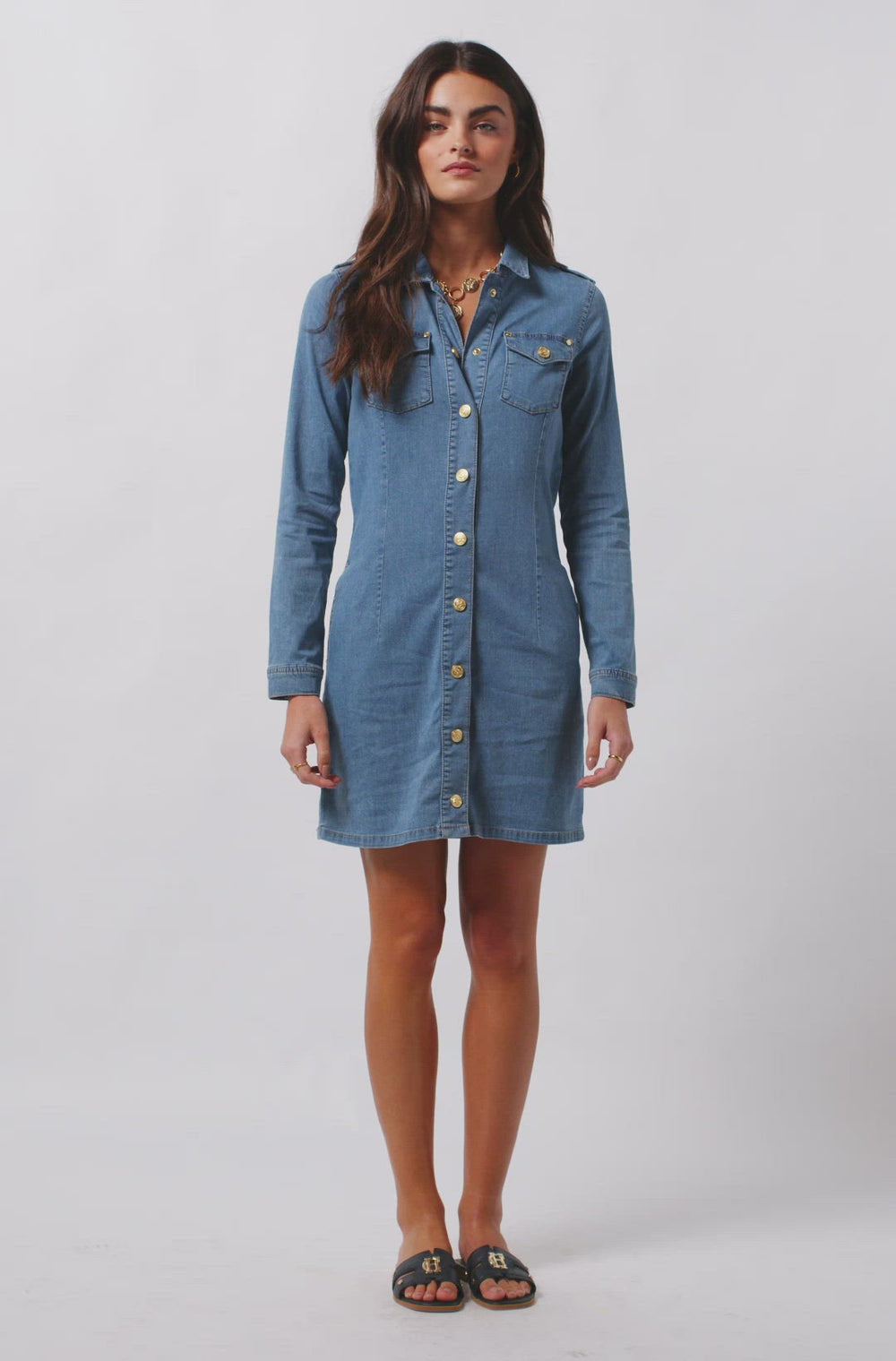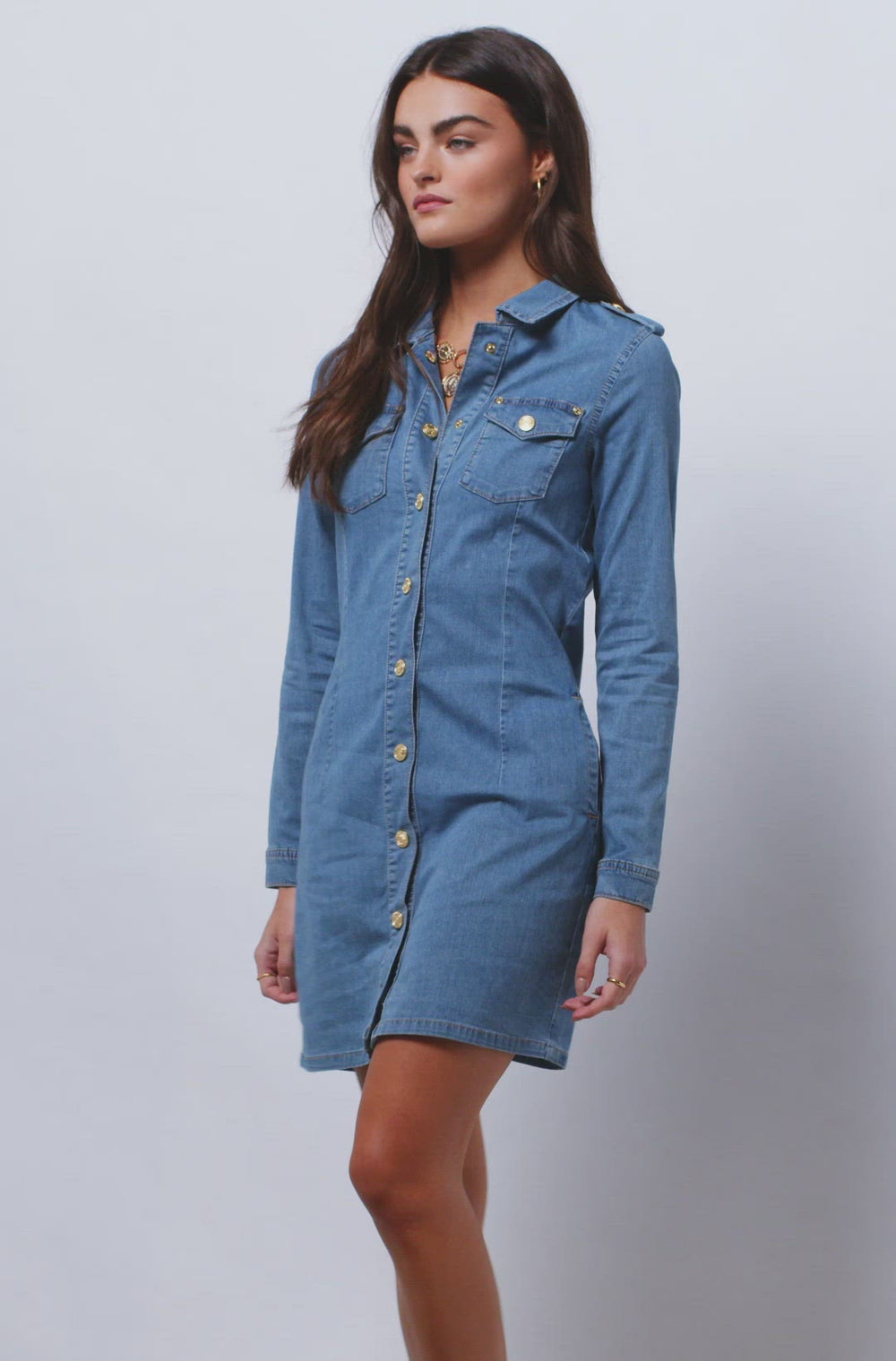Designed with long sleeves and a mini length, this dress has been created with a pencil silhouette and turn-down collar. Created from a soft denim and detailed with shoulder epaulettes, chest & side pockets and finished with our iconic hardware.