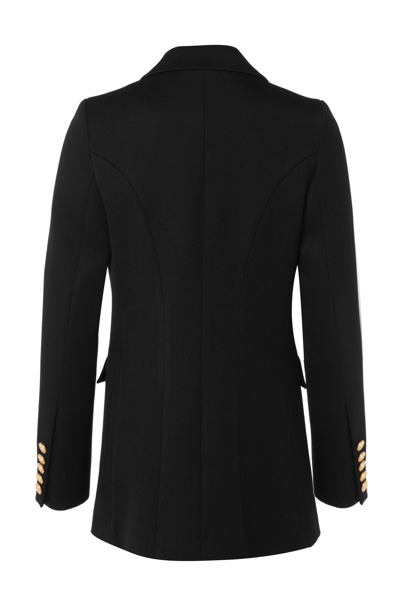 This longline double breasted wool blazer is a chic trans-seasonal forever wardrobe essential. Designed to create a sharp tailored silhouette worn open or closed. Fully lined with a luxury stretch lining for extra comfort and adorned with HC signature Gold buttons on the front and cuffs. This blazer has been hand cut and made entirely in England using wools woven in the UK.