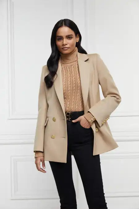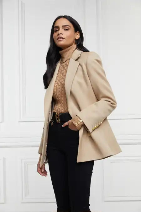 This longline double breasted wool blazer is a chic trans-seasonal forever wardrobe essential. Designed to create a sharp tailored silhouette worn open or closed. Fully lined with a luxury stretch lining for extra comfort and adorned with HC signature gold buttons on the front and cuffs. This blazer has been hand cut and made entirely in England using wools woven in the UK.