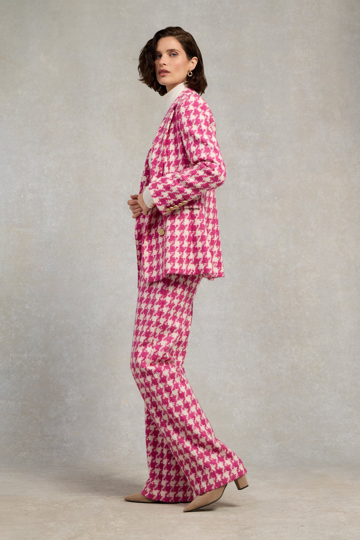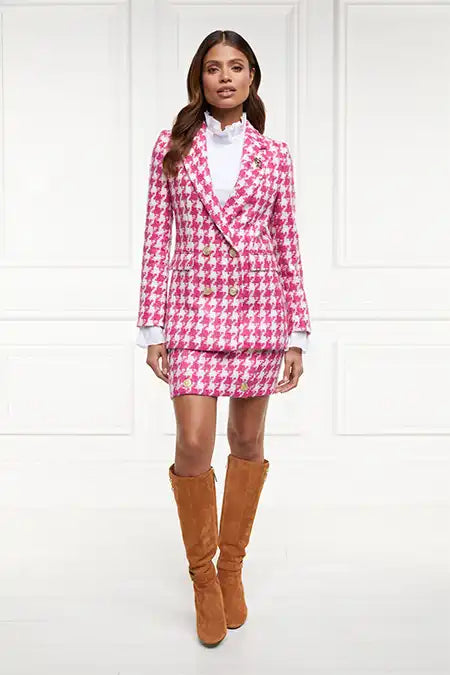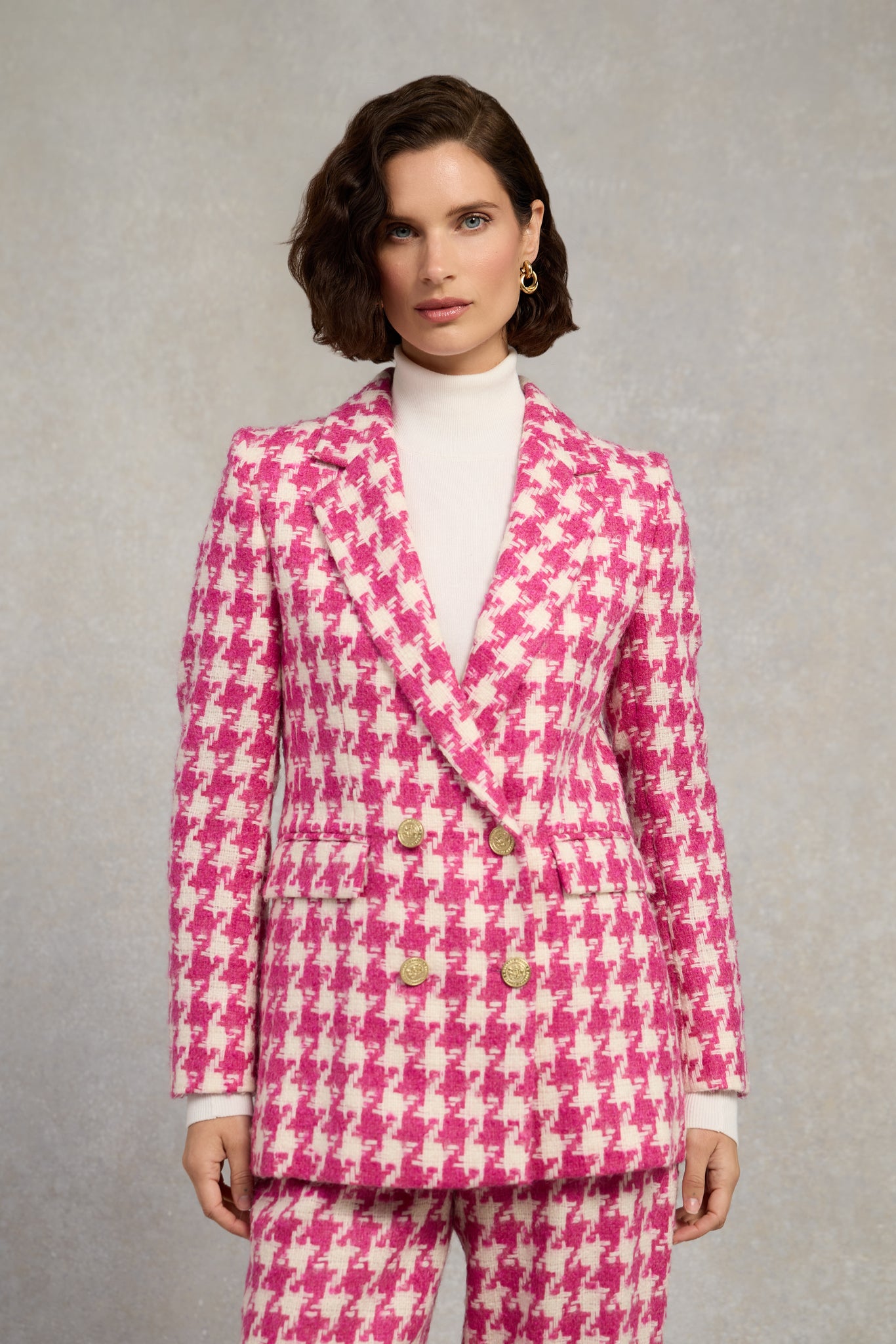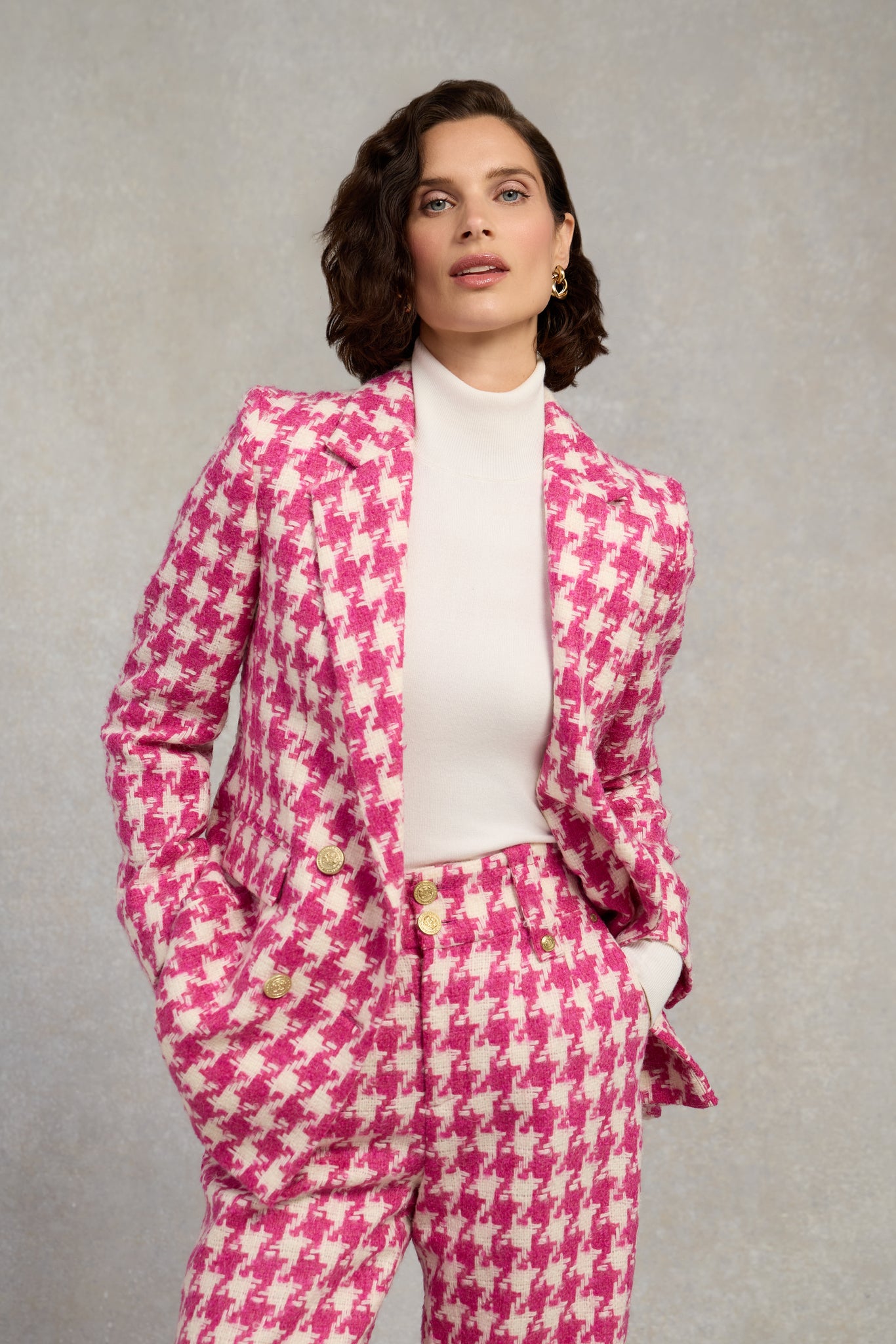 Designed to create a sharp tailored silhouette worn open or closed, the Double Breasted wool blazer has been handmade in the UK. Crafted from our statement houndstooth fabric & fully lined with a luxury stretch lining for extra comfort, this piece is a must-have staple for your wardrobe. With bold lapels & subtle hip pockets, each blazer has been elevated with HC signature gold hardware to the front and cuffs.