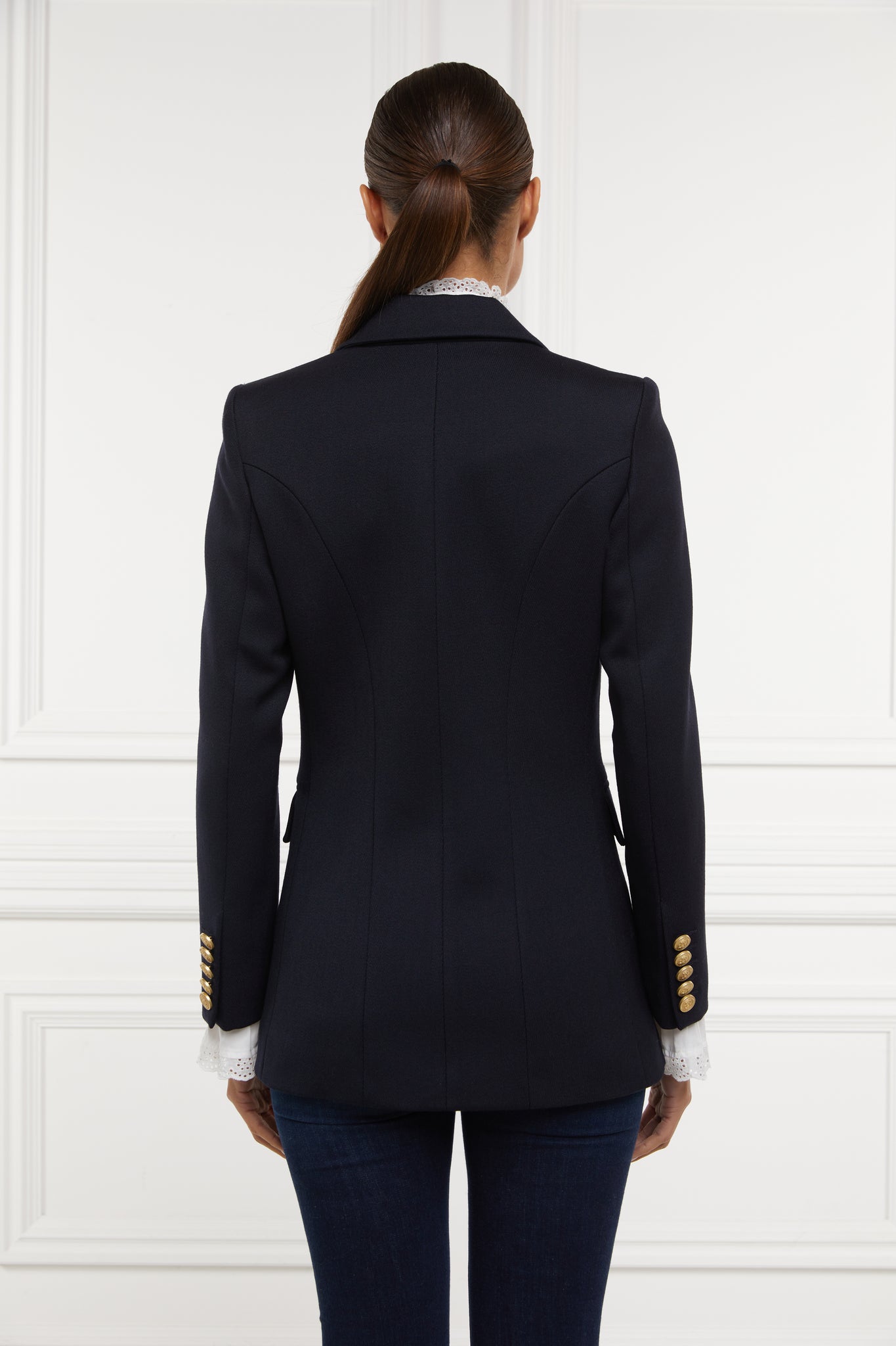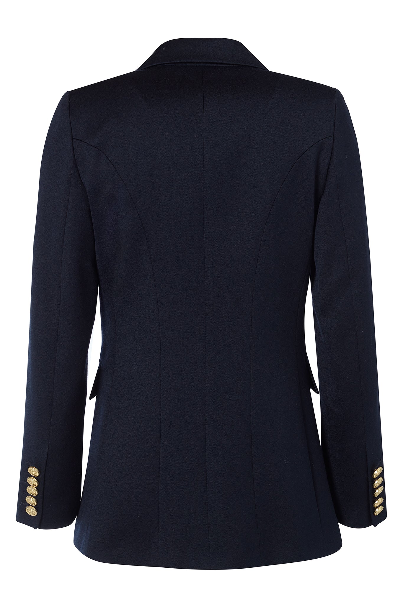 This longline double breasted wool blazer is a chic trans-seasonal forever wardrobe essential. Designed to create a sharp tailored silhouette worn open or closed. Fully lined with a luxury stretch lining for extra comfort and adorned with HC signature Gold buttons on the front and cuffs. This blazer has been hand cut and made entirely in England using wools woven in the UK.