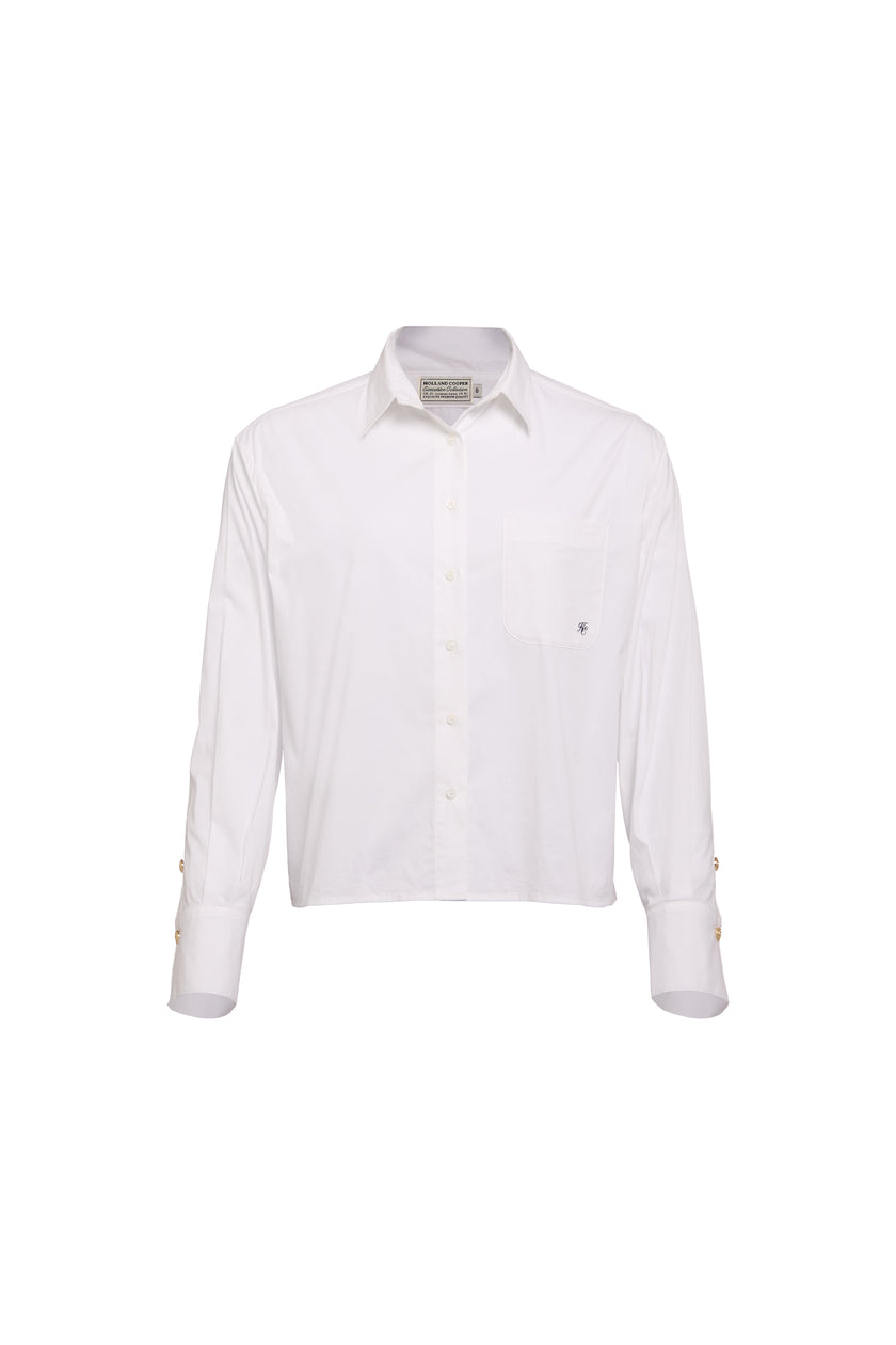 Elevate your wardrobe essentials with our exquisitely crafted Eleanor Shirt. This refined piece showcases a relaxed, boxy silhouette crafted from premium cotton blend fabric, ensuring both comfort and sophistication. Featuring our signature HC embroidery on the front patch pocket in distinguished navy, this shirt epitomises understated British luxury. The box pleat back yoke ensures a flattering fit, while engraved poly buttons and our iconic gold-finished cuff buttons add those quintessential finishing touches. The slightly cropped length offers versatile styling options for the modern wardrobe.