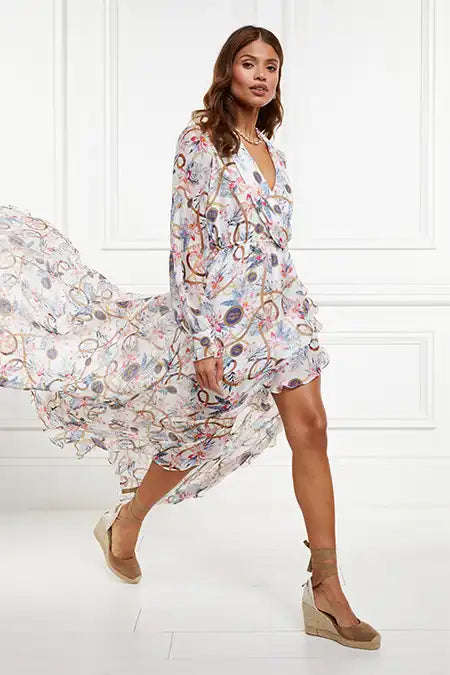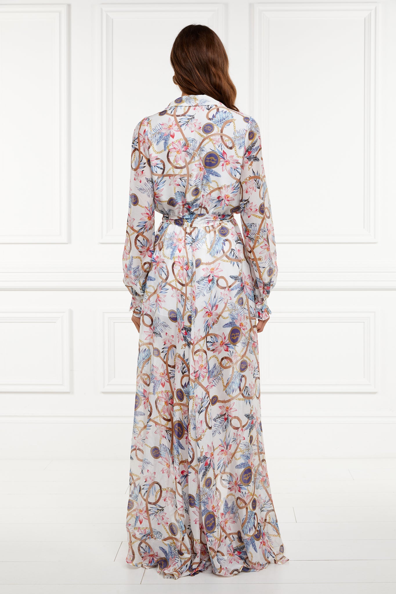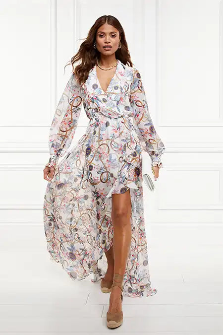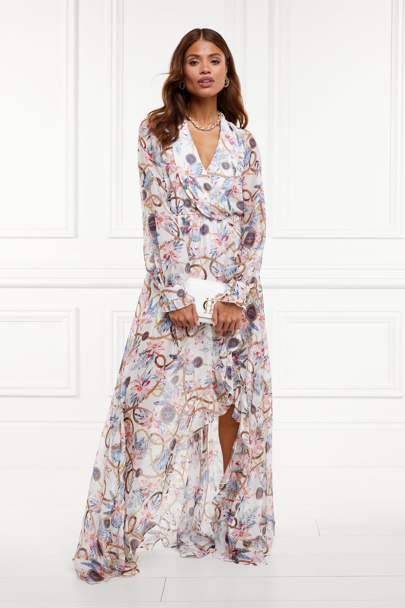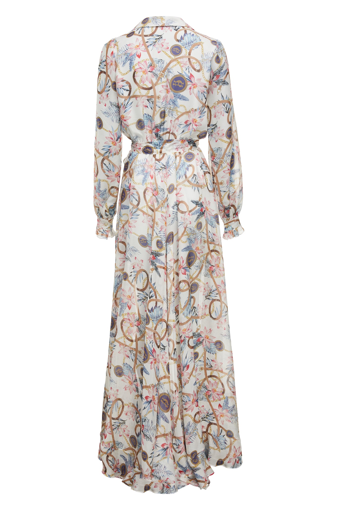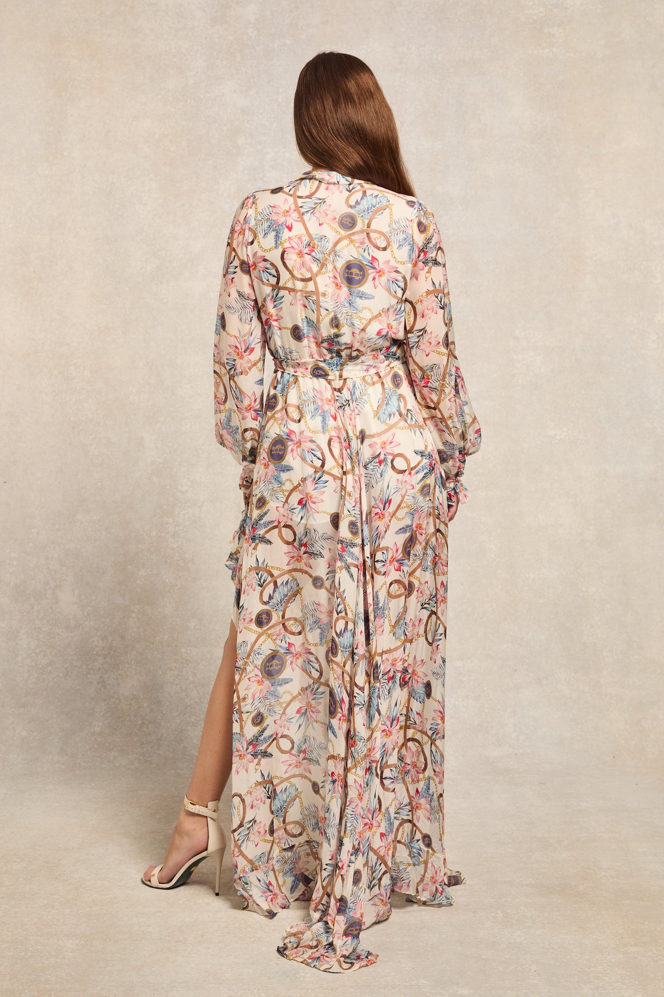This stunning full length maxi dress is made from sumptuously soft pure silk with a meticulously hand drawn design inspired by tropical paradises. This wrap dress is made of billowy long sleeves accompanied by a subtle HC button closure with ruffled edging along the hem and cuff.