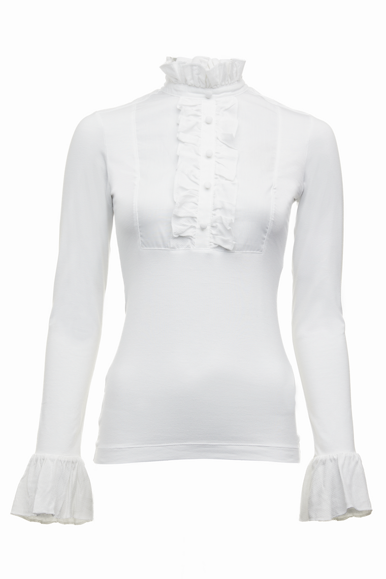 Designed as a neatly fitted shirt with feminine frills on the front and cuffs giving a softness to the blouse. This blouse is highly versatile, style with our high-waisted peg trousers or layer under one of our jumpers with the collar and cuff peeking out.