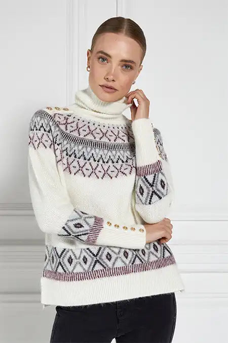 Designed with a longer length and super high roll neck, the Fairisle Knit's relaxed look and feel is perfect for pairing with jeans for an elevated everyday outfit.Created from an extra soft yarn with a traditional 'Fairisle' design, this knit is a timeless piece for your wardrobe.Detailed with our iconic gold hardware on both the cuff and shoulders.