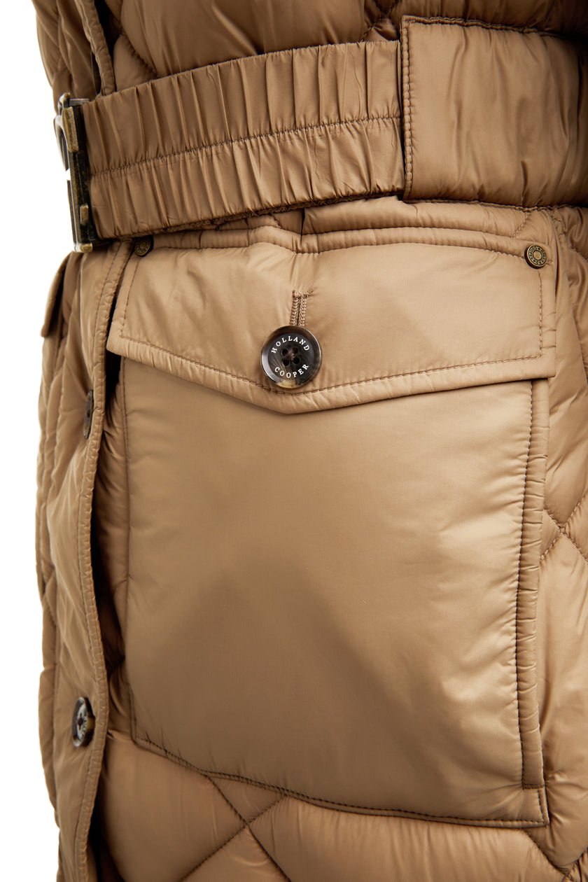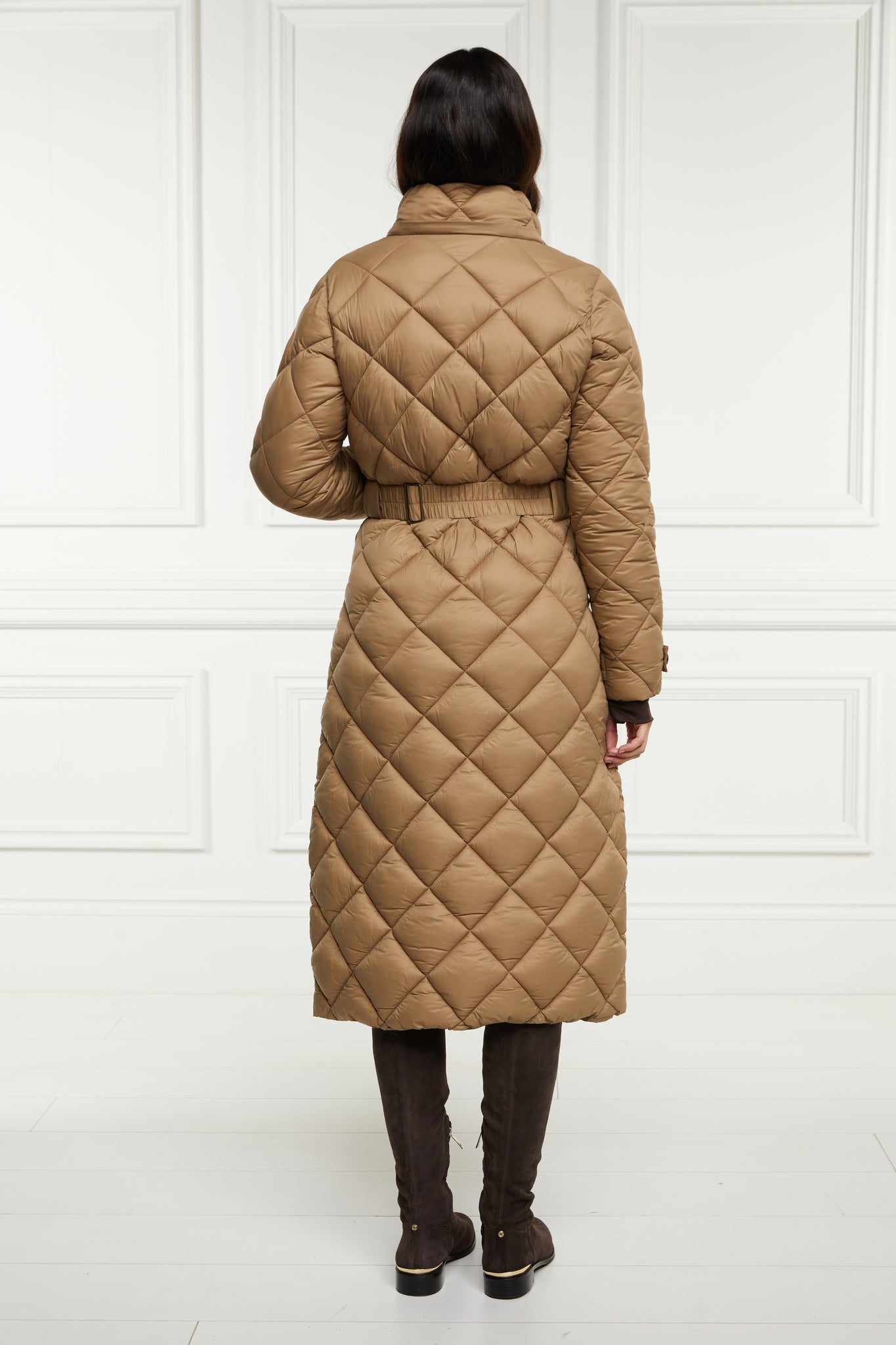 Designed with a full-length & slim silhouette, this country coat is both lightweight & wearable. Constructed from a classic diamond quilted fabric with a belted waist & detachable hood. Detailed with horn-style buttons and finished with antique brass hardware, this piece is a true nod to country elegance. -
