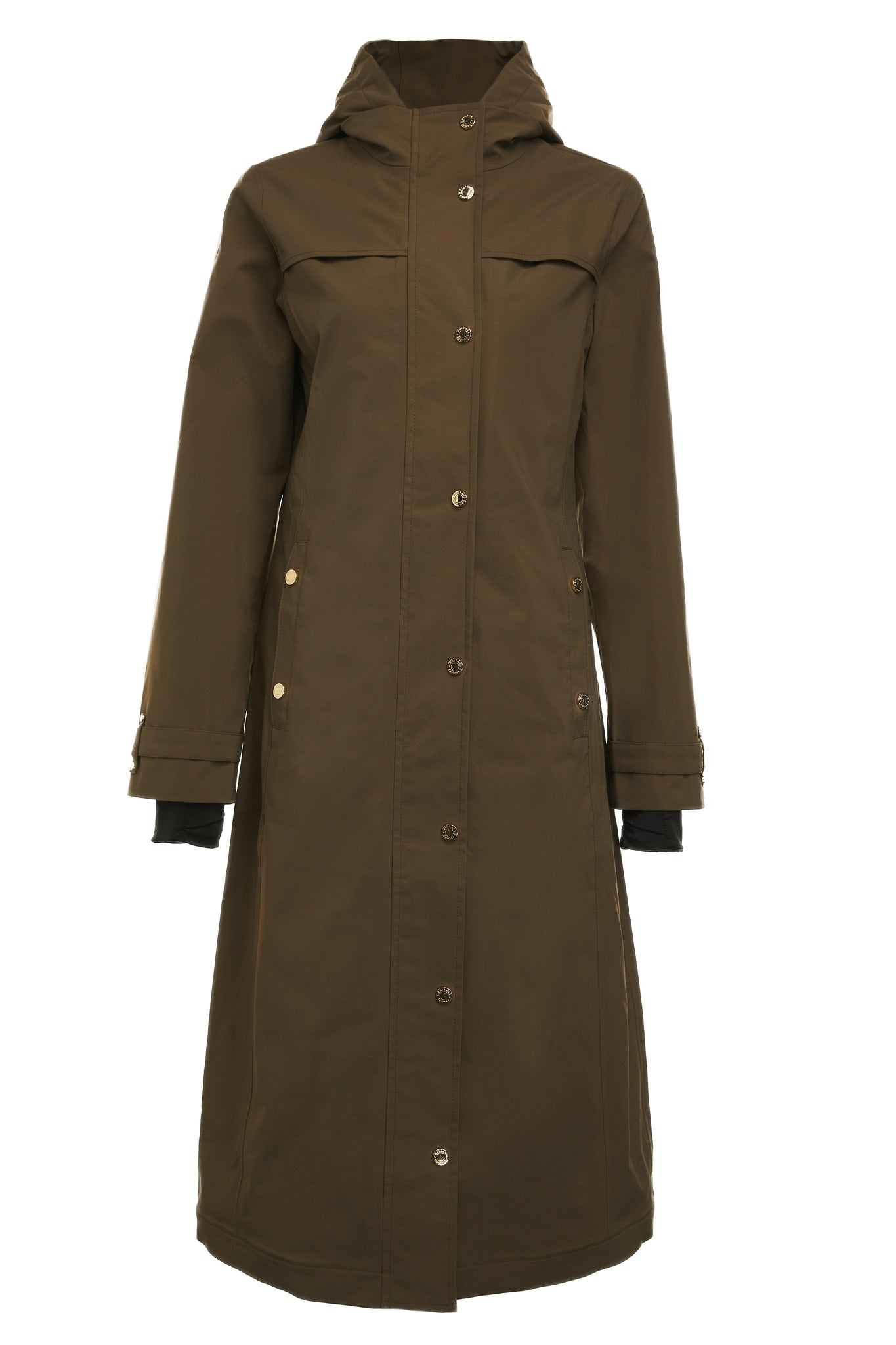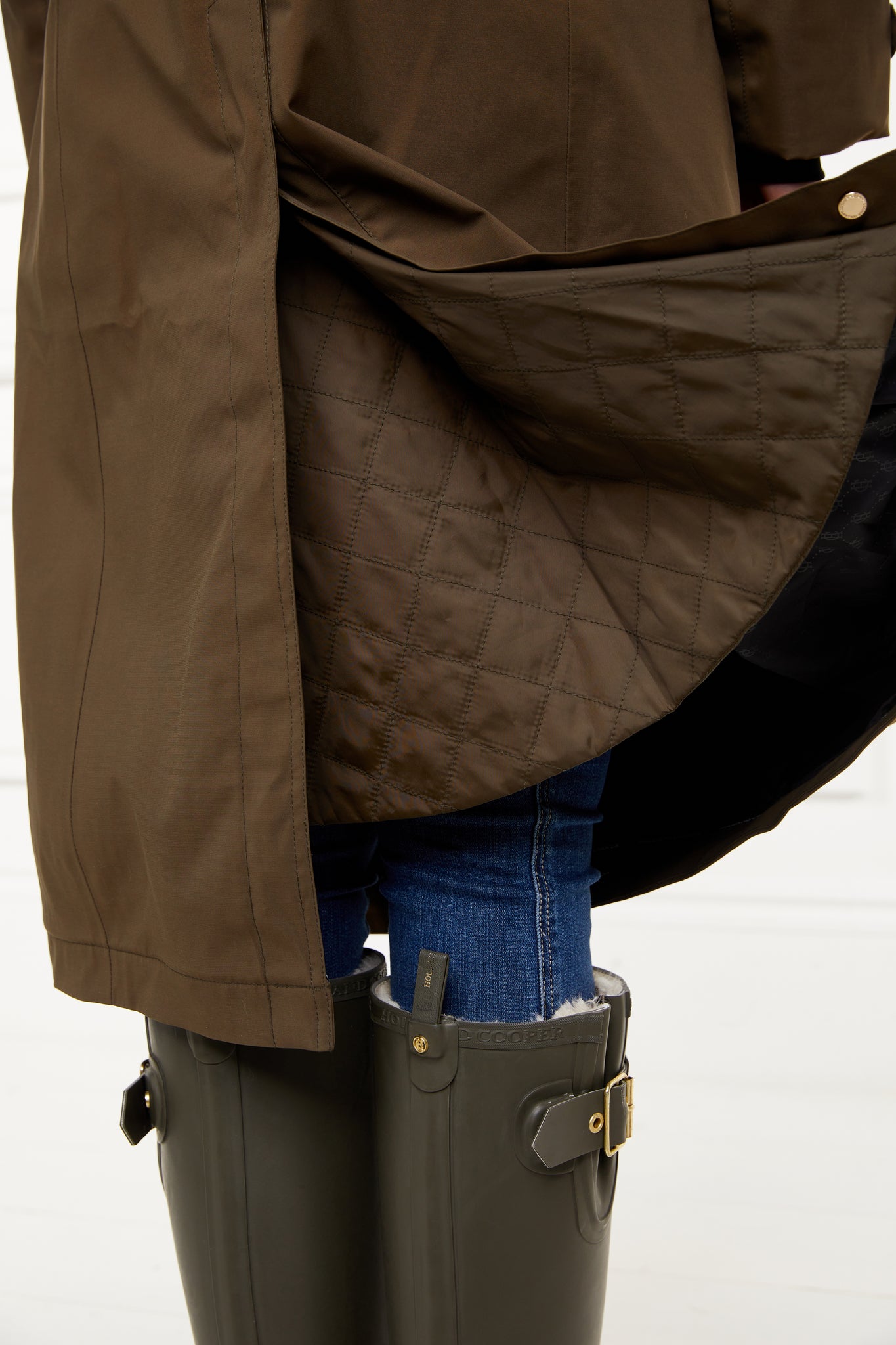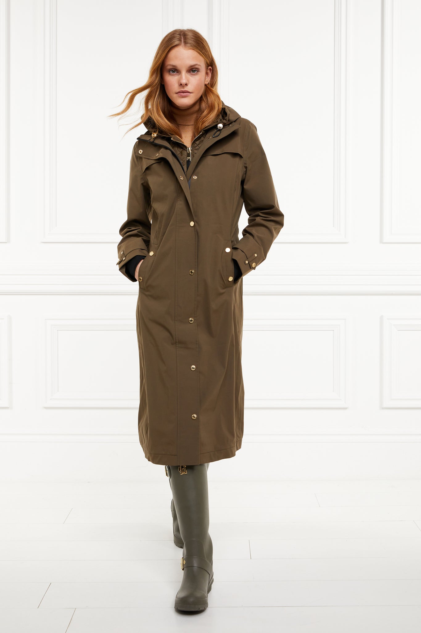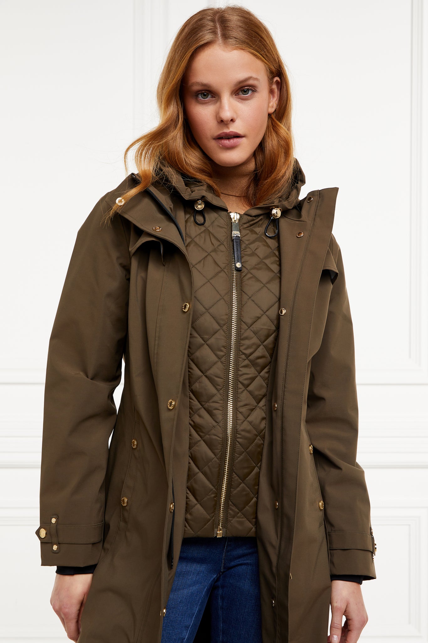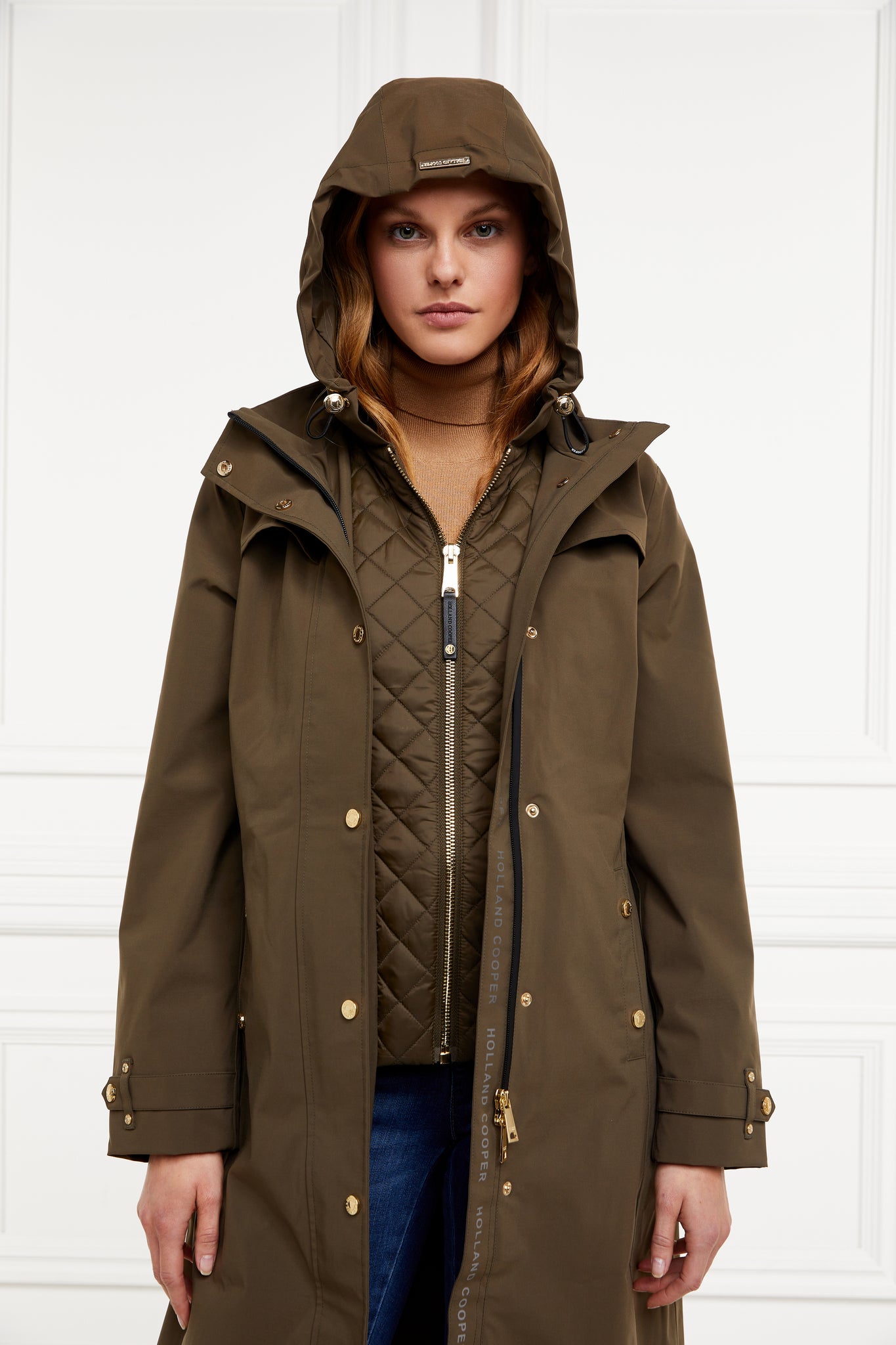 Elegant and slim fitting, this long length rain coat is the perfect companion for a rainy day. Meticulously constructed from waterproof materials with taped and sealed seams, this coat has a modern, technical feel. It comes with a built in padded vest for added warmth along with large lower welt pockets to the front and is detailed with our iconic gold HC hardware.