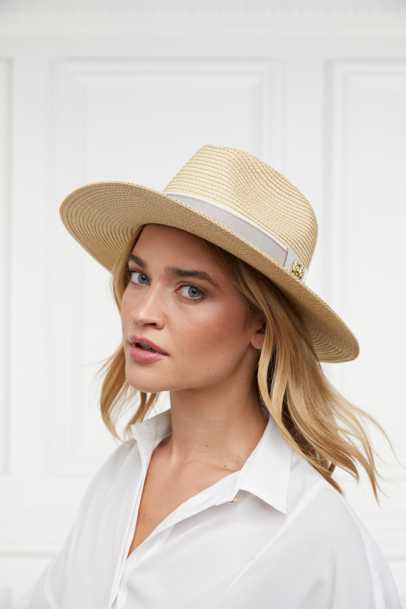 Endlessly versatile, our new sunhat effortlessly complements all your favourite summer ensembles. Hand crafted from the finest beige straw, the shorter brim ensures a contemporary look. Detailed with cotton trim and gold, HC rivet.